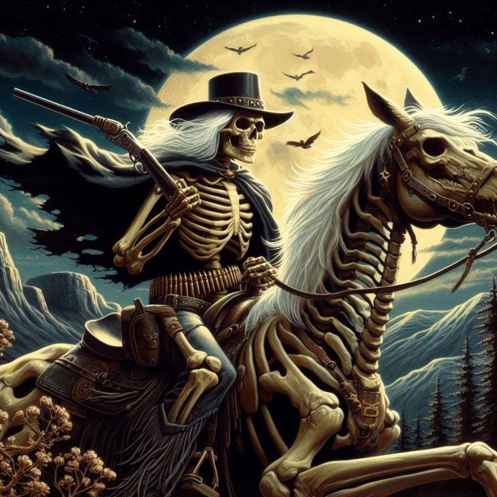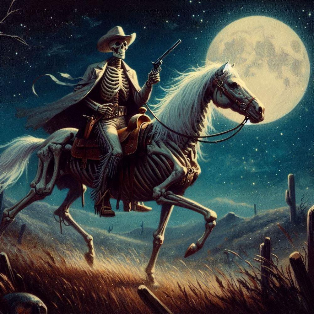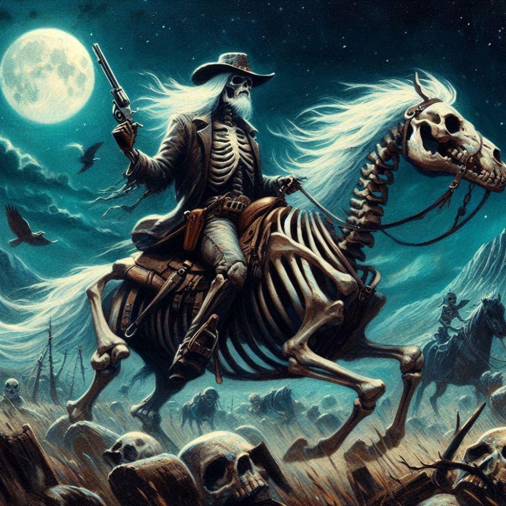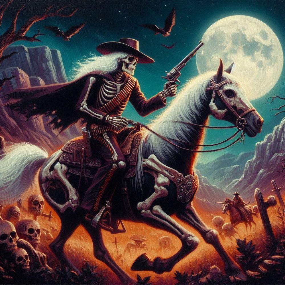 油絵ホラー西部劇ファンタジー、月夜の荒野に骨の馬に乗った白髪骸骨のカウボーイ