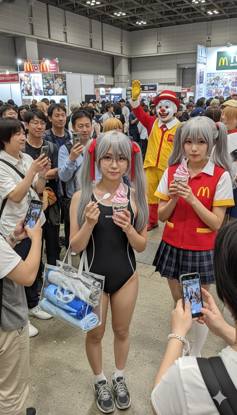 中高年や外国人の観光客が写り込んでいることで、コミケのリアルな雰囲気が伝わってきます。ドナルド=マクドナルドが写っている場合、さらに面白い写真になっているでしょう。