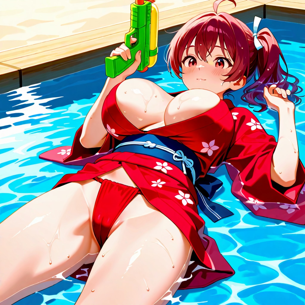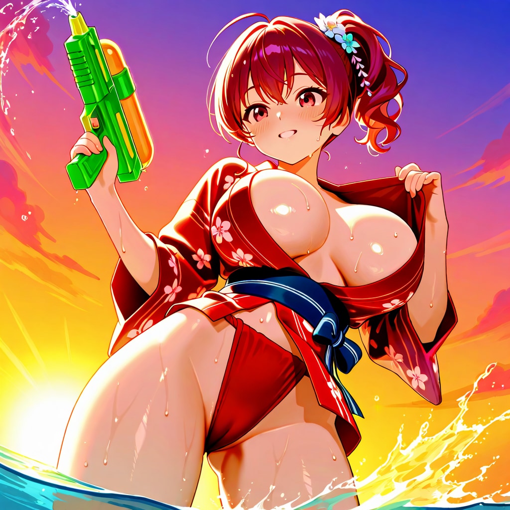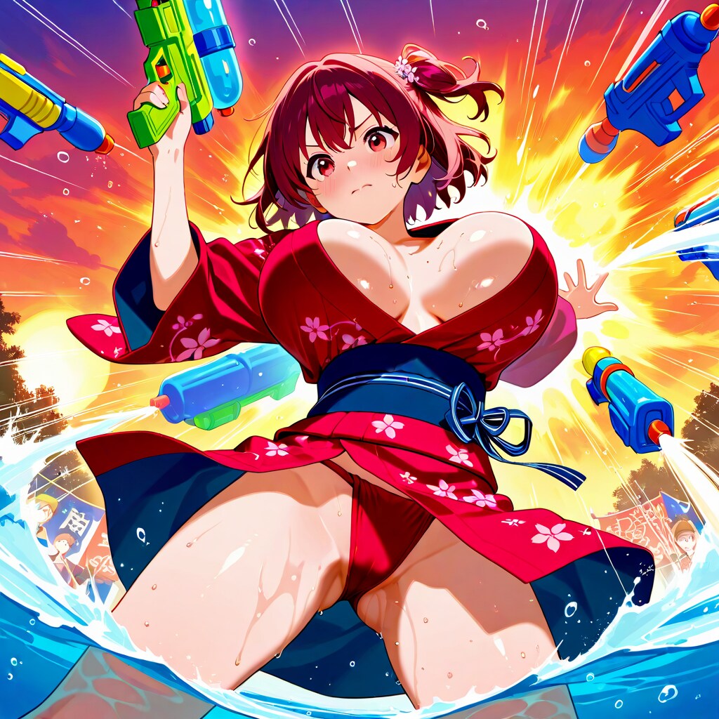 赤リボンちゃんの夏祭り、浴衣でウォタガン大会に出て大はしゃぎ