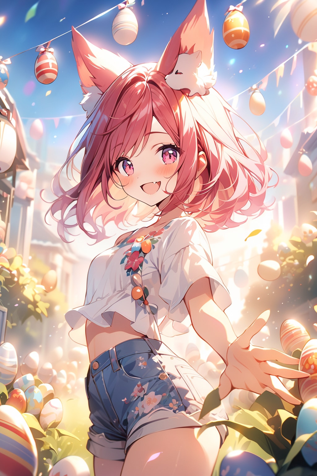 構図や光はとてもいいのですが、手前の女の子がfox ears, そしてふつうにwhite rabbitsで指定して召喚されたうさぎさんたちが競合して、全員の耳が兎耳と狐耳のミックスになって謎の白い生き物になっています。😂