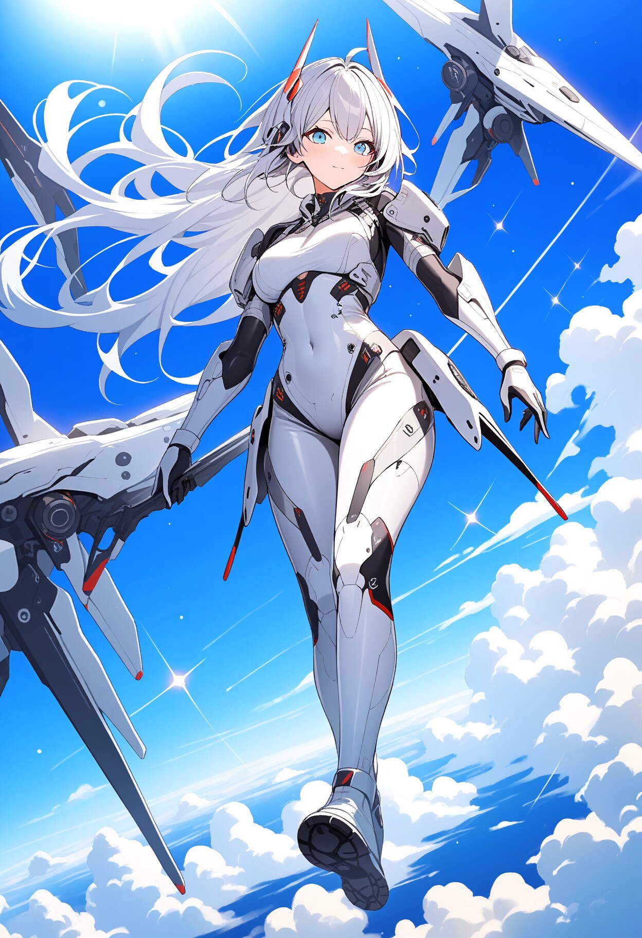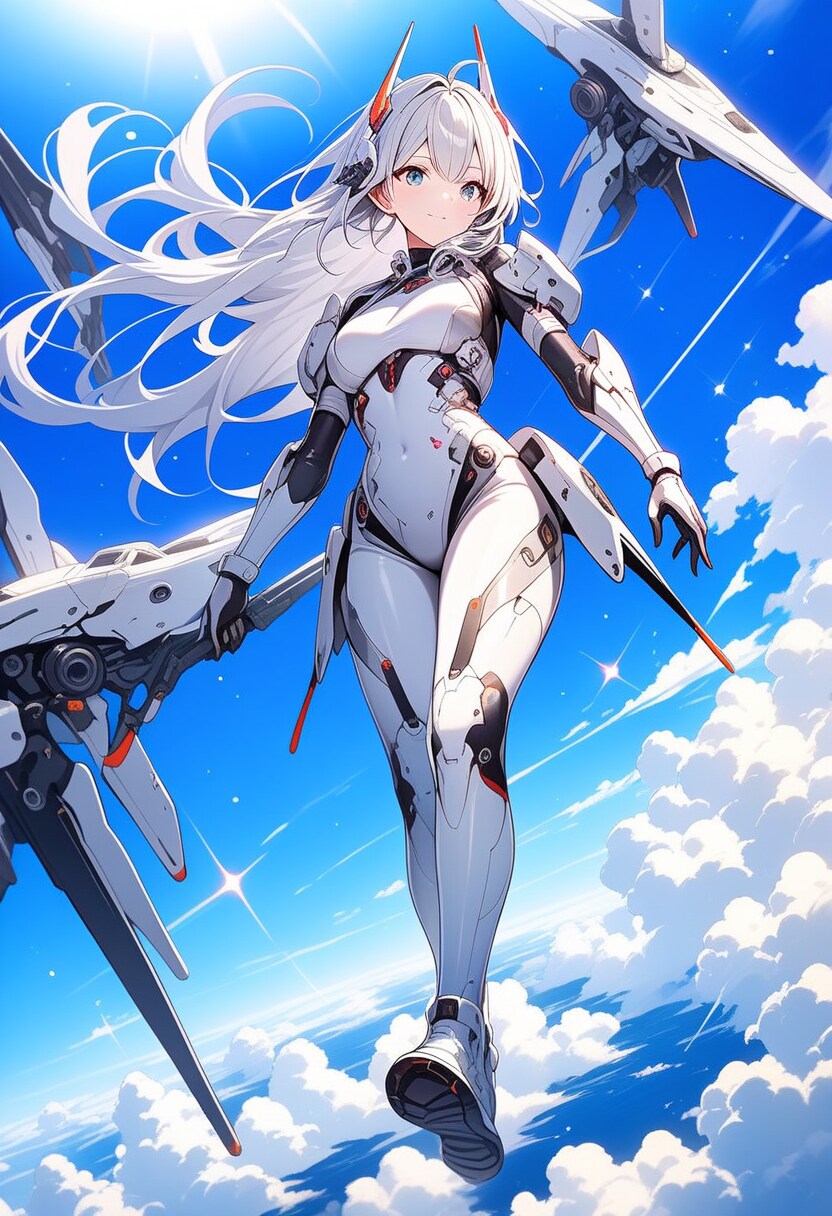 特徴は空を歩くことに軸を置いたので,(walking above blue sky, flying above:1.4),(blue sky:1.4)
