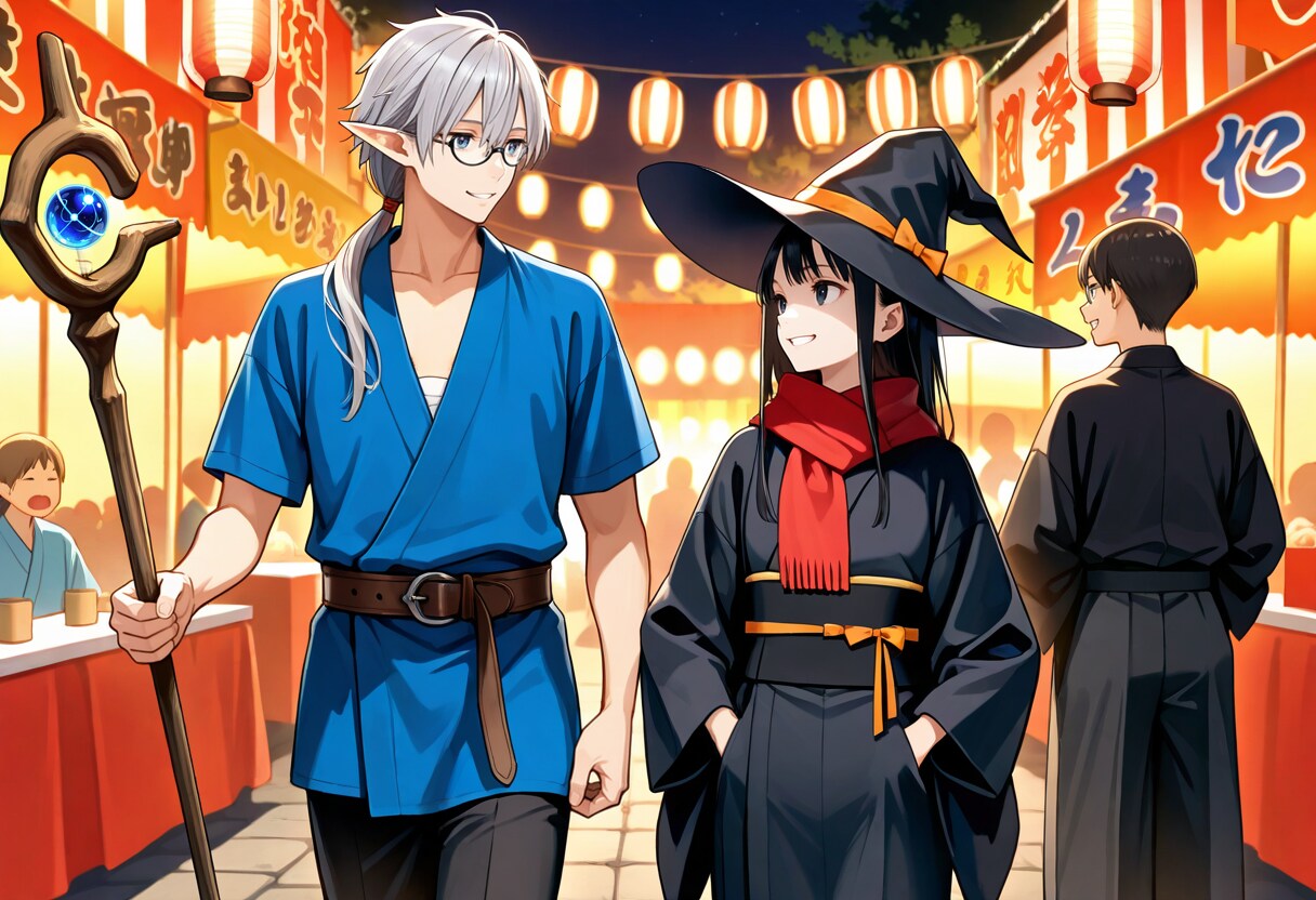 半エルフの魔術師オルウェンさんを道案内するいつもの魔女さんのファンアートコラボレーション