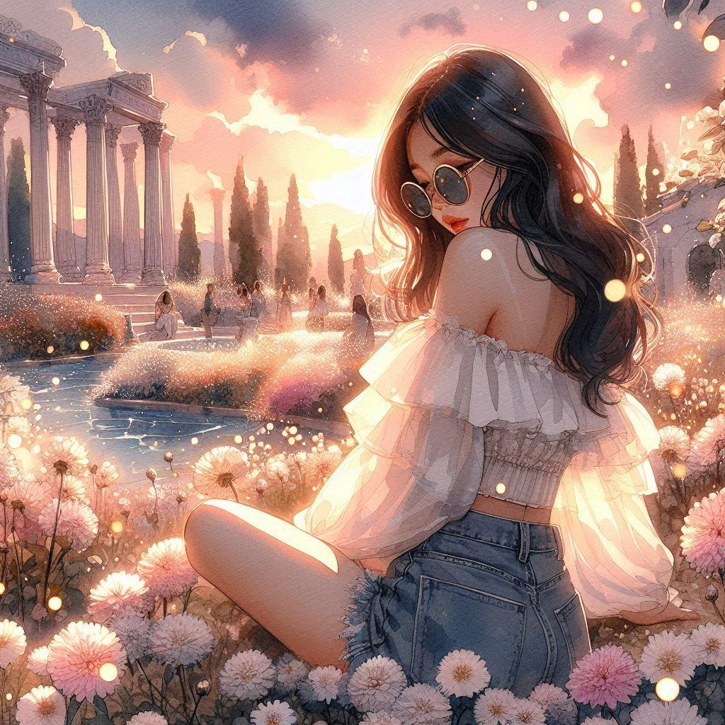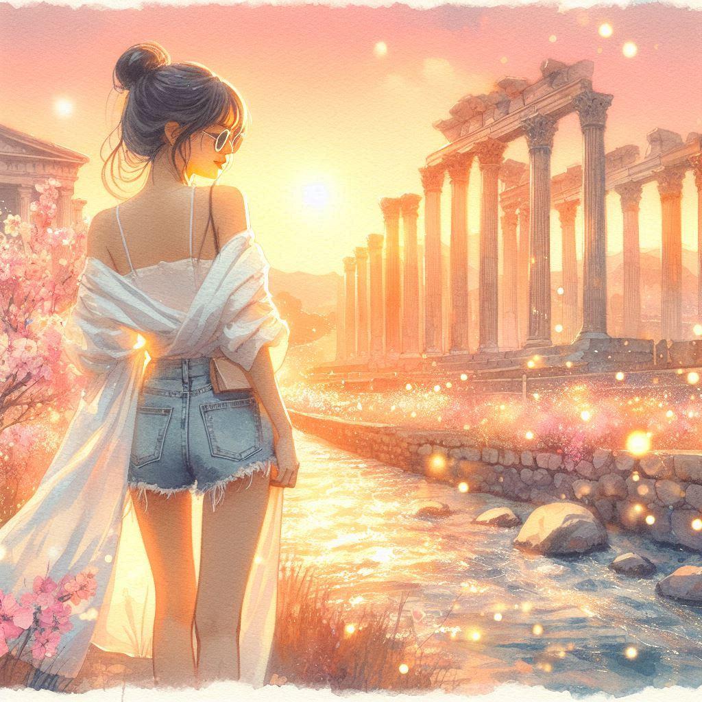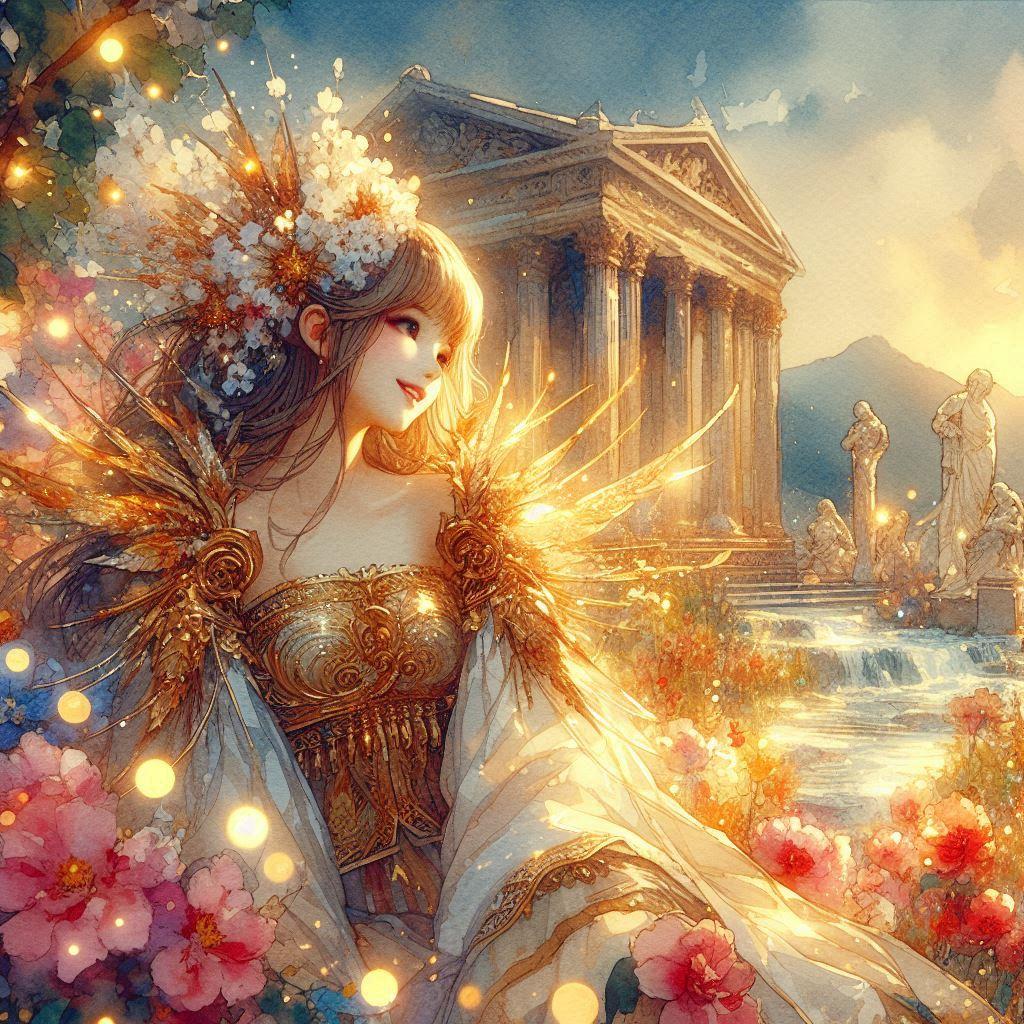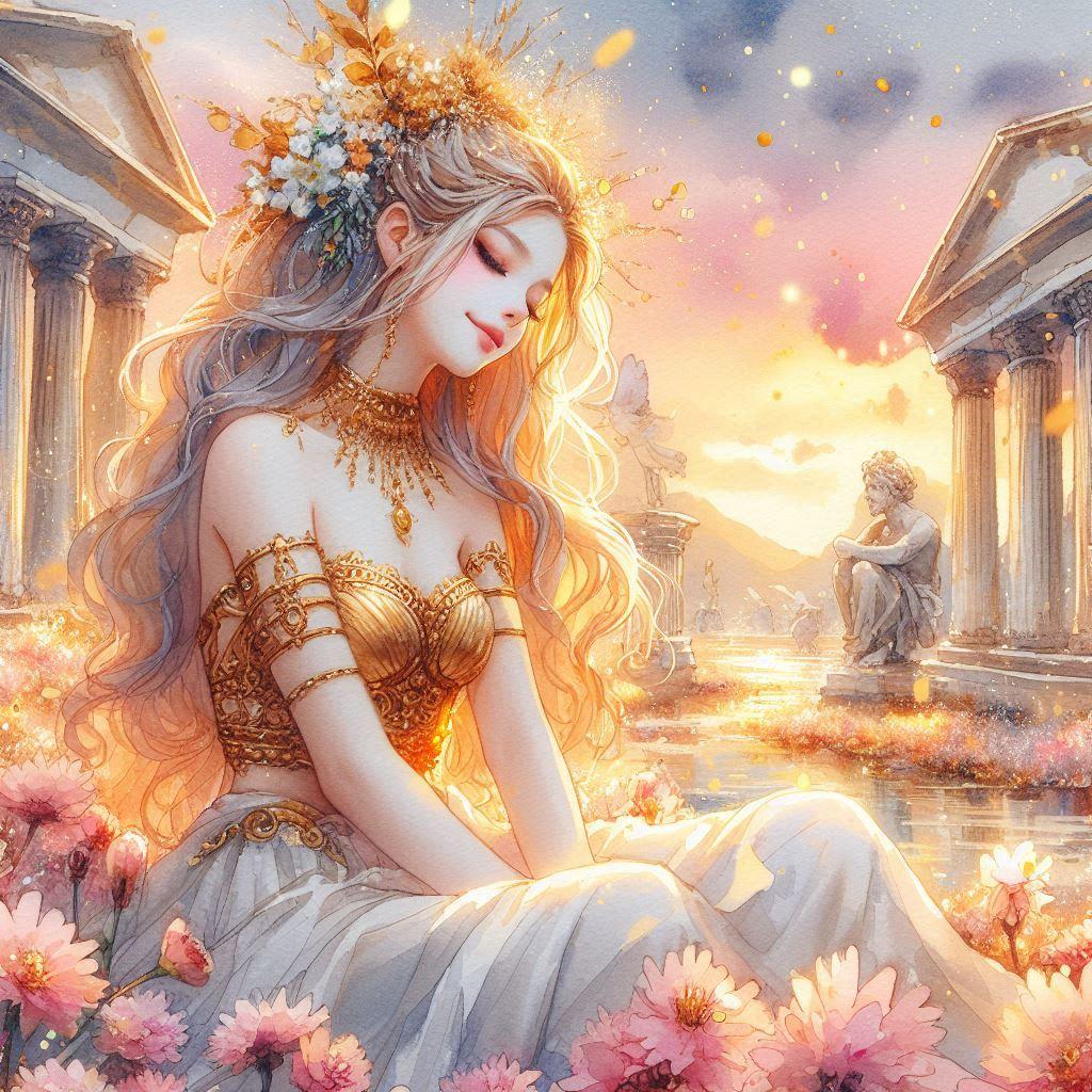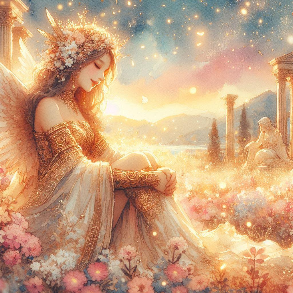 a divine paradise,white marble Greek temples, blooming flower fields, golden-pink sky, shimmering light particles, crystal river