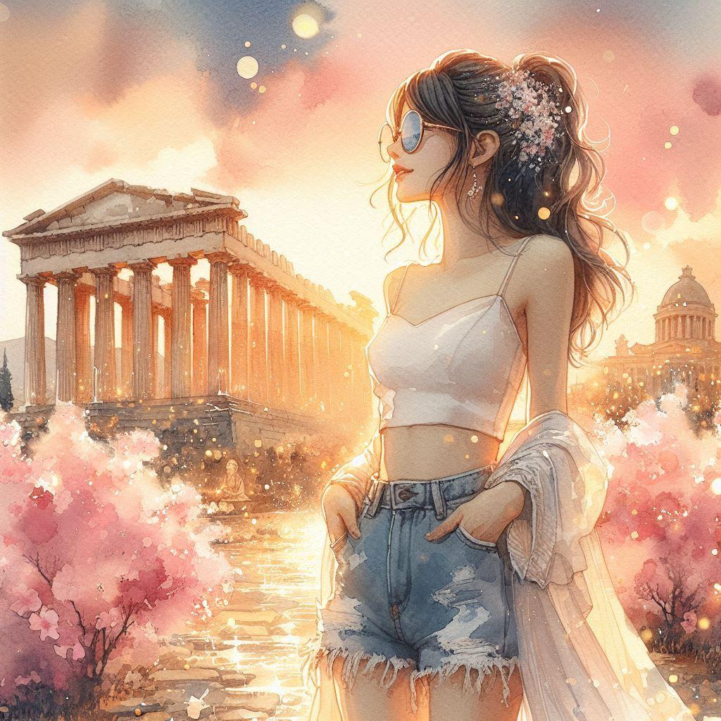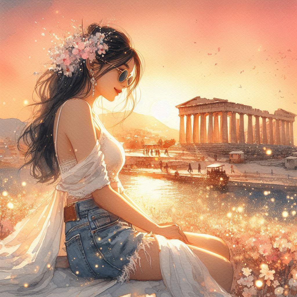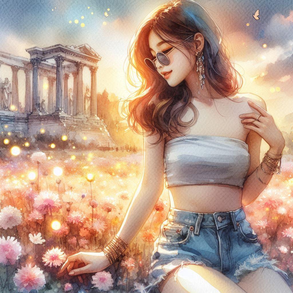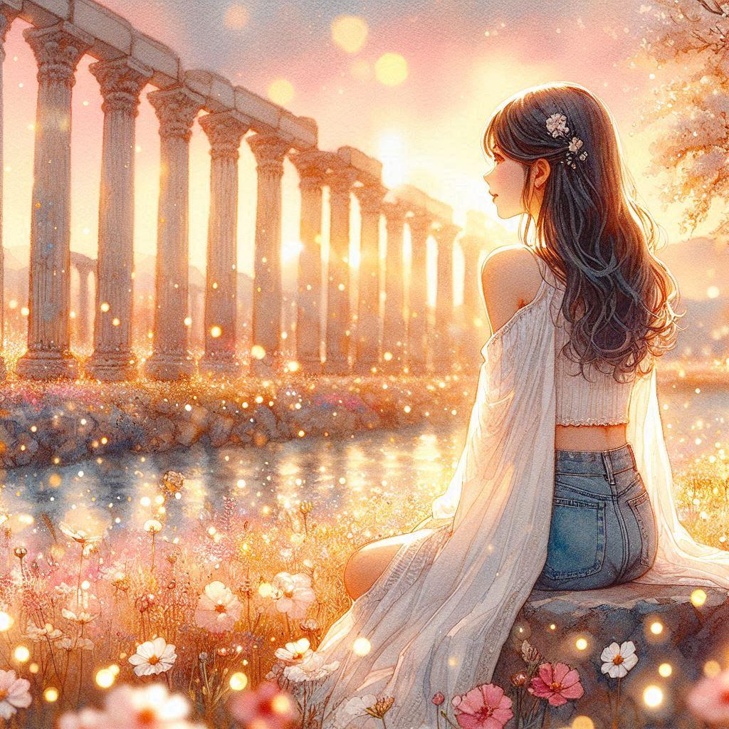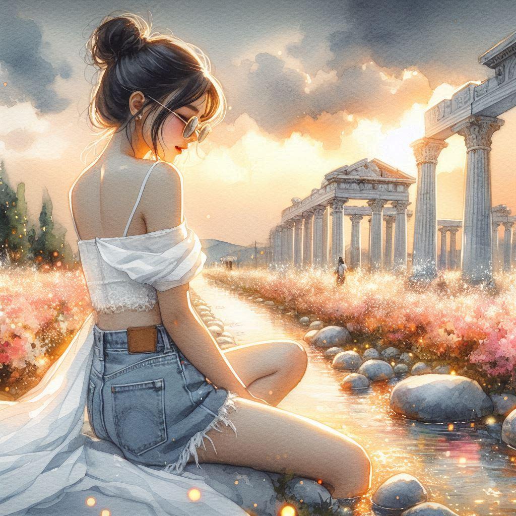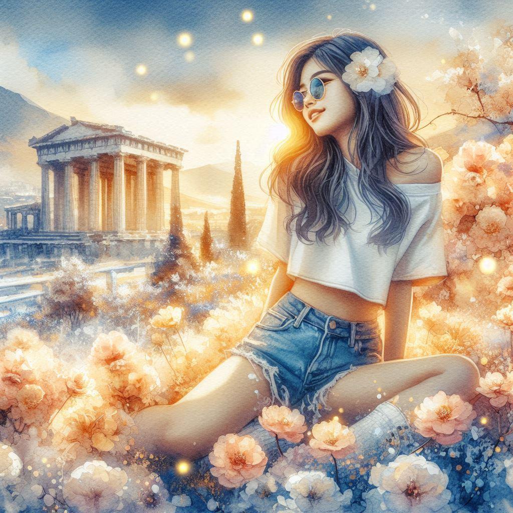 a divine paradise,white marble Greek temples, blooming flower fields, golden-pink sky, shimmering light particles, crystal river