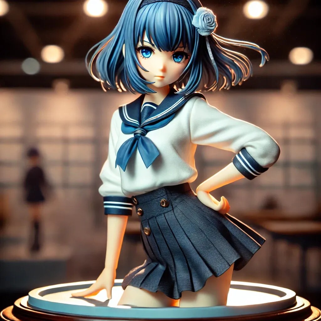 青髪ボブ子ちゃんが大学生モデルとしてデビュー当初に着ていた高校時代の制服姿を再現。真剣な表情でポーズをとる姿が立体化され、学生モデルとしての初々しい魅力が感じられるフィギュアです。