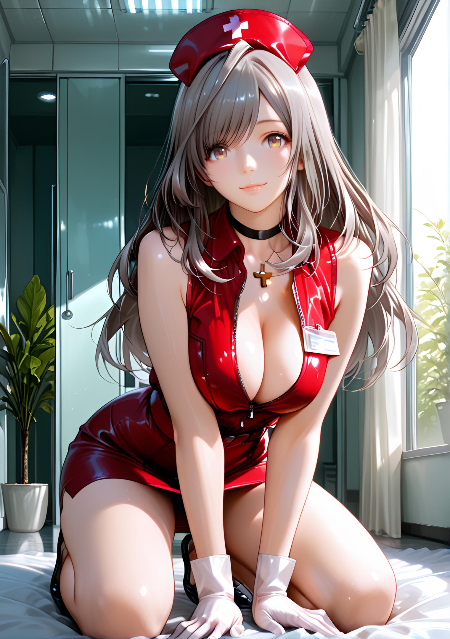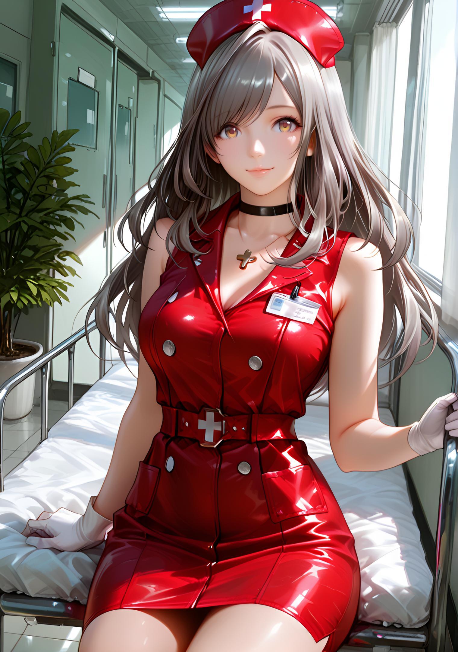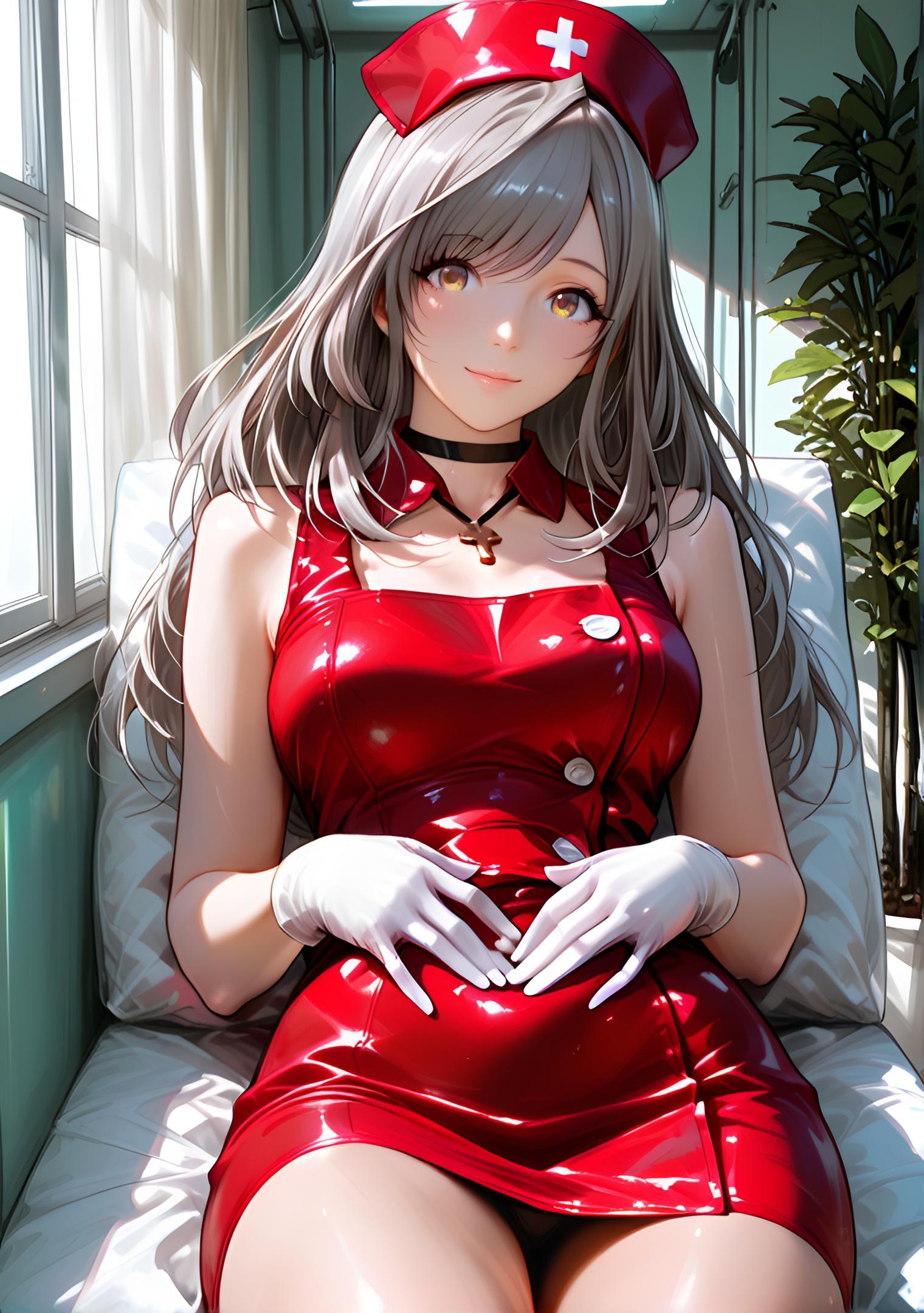 - white and crimson nurse uniform, high-quality glossy latex texture, short-sleeved fitted top, tight skirt, black belt with silver buckle, crimson cross armband, white stockings, black patent heels, metallic stethoscope, silver nurse cap with red cross # クリムゾン・メディカルシールド