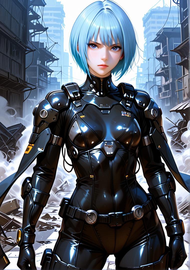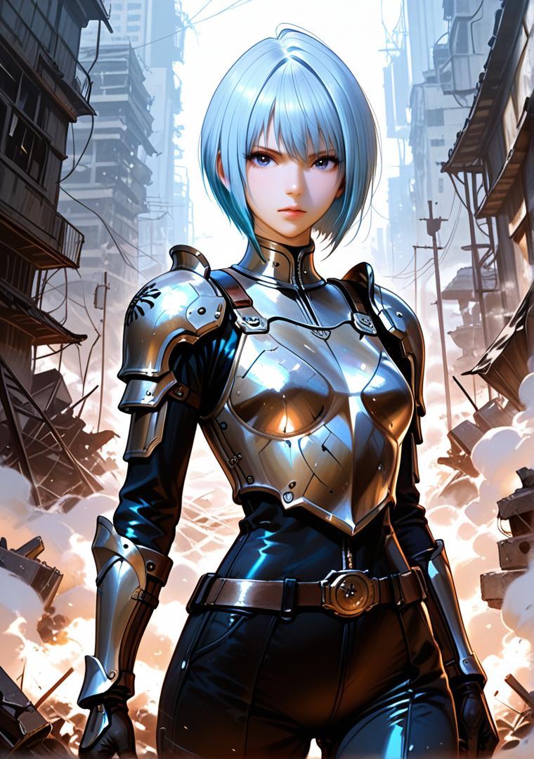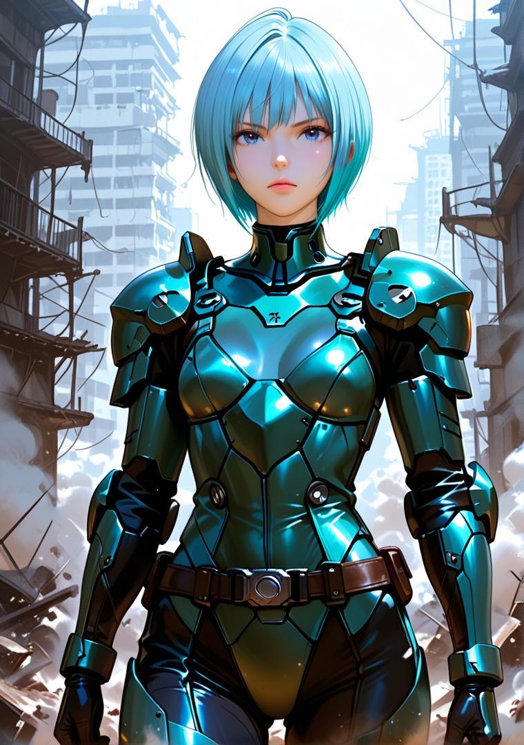 sapphire blue armored bodysuit with layered composite plating and soft glow seams # 複合層装甲と淡く光る縫い目を持つサファイアブルーの装甲ボディスーツ