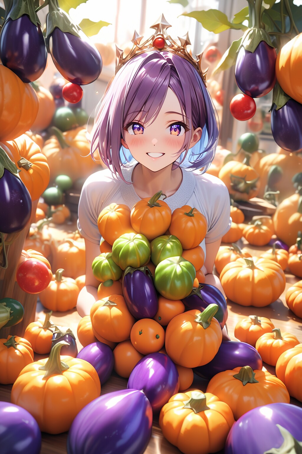 感謝のクラウンを代表してなすび色の髪の毛の女の子に乗せます。