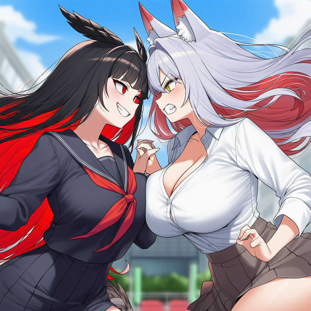 girl, angry, silver hair, yellow eyes, fox ears, slit pupils, fang,