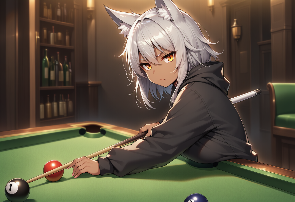 girl, medium breast, sharp eyes, piercing gaze, black hoodie, tanned skin, amber eyes, {{frown}}, healthy complexion,messy hair, medium-length silver hair, wolf ears, fur-covered ears, Billiards, -1.5::breast cleavage::