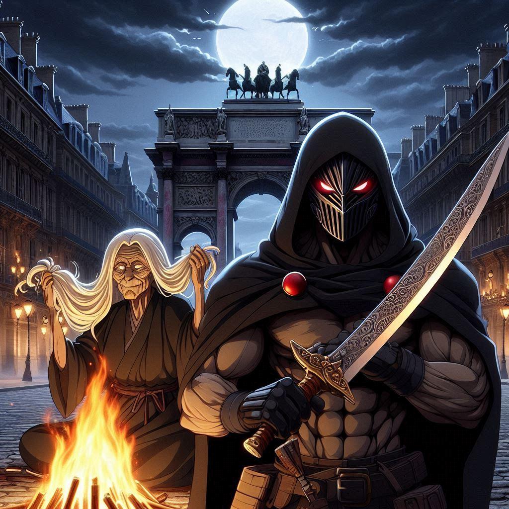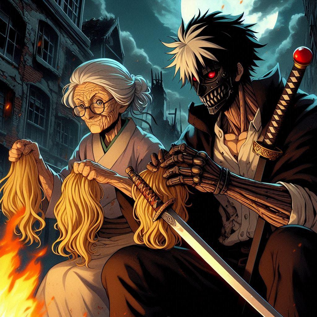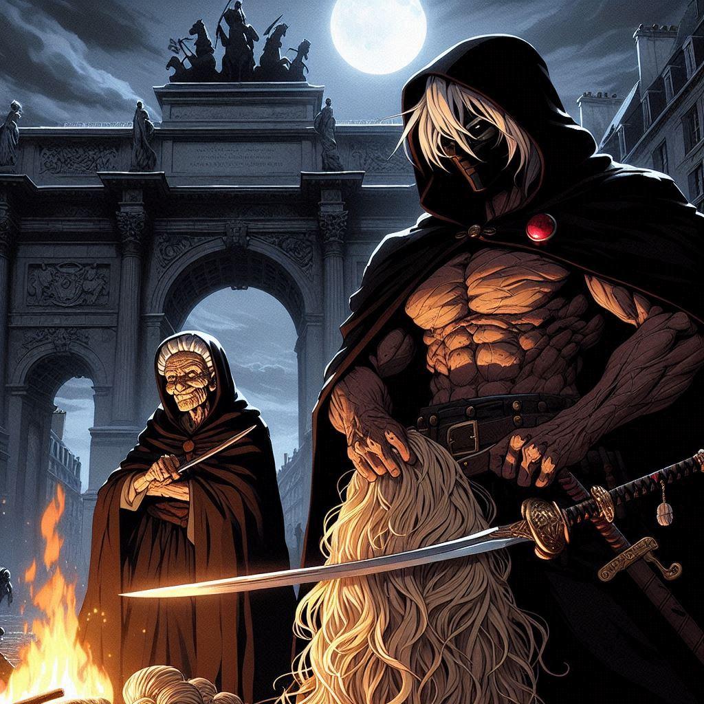 金髪のウィッグを手にした老婆と、筋骨逞しい覆面の男。