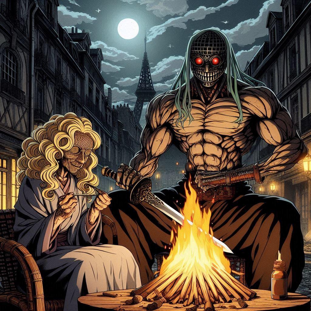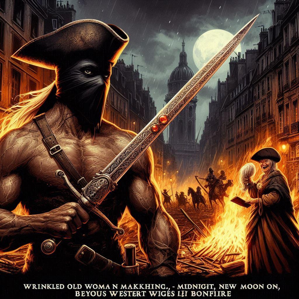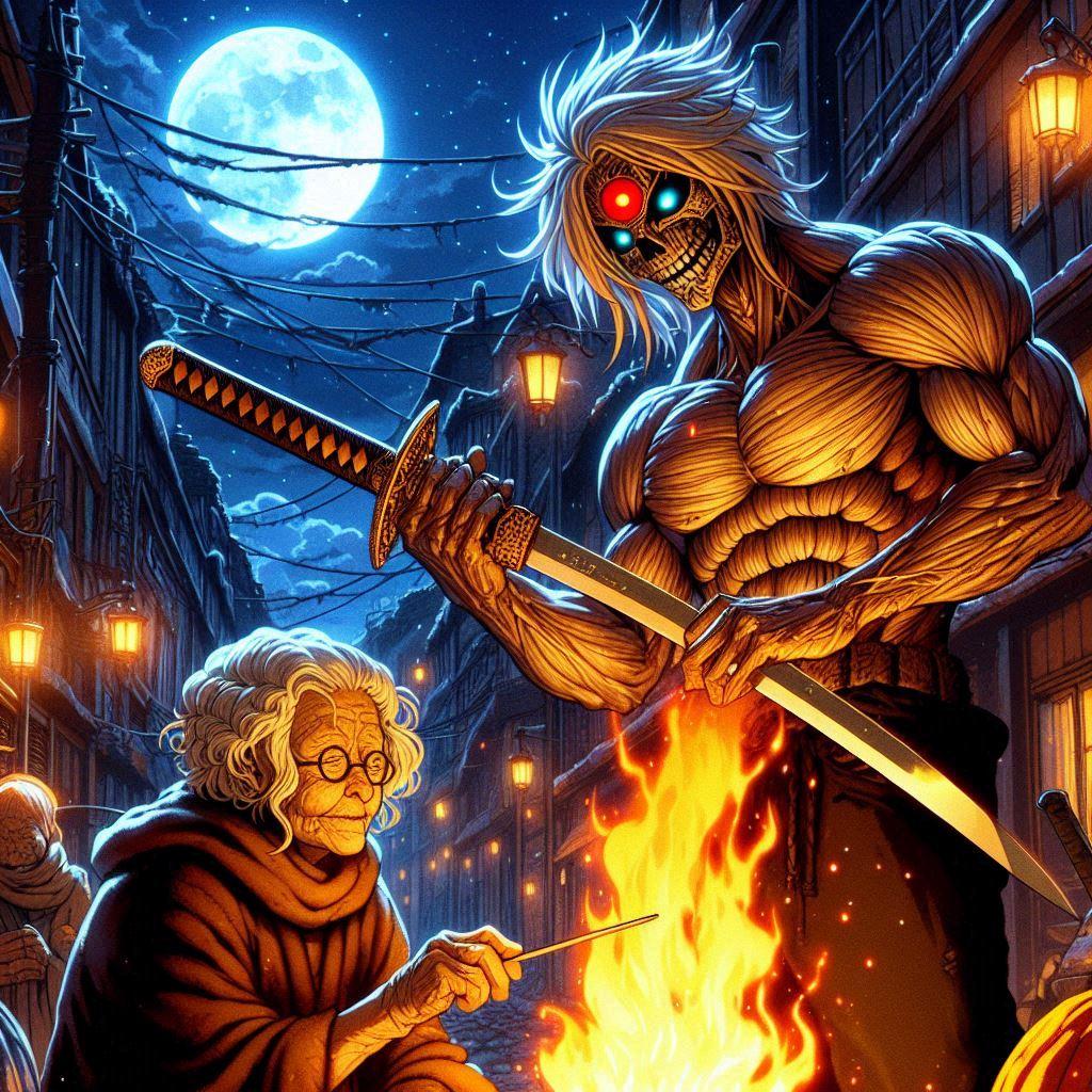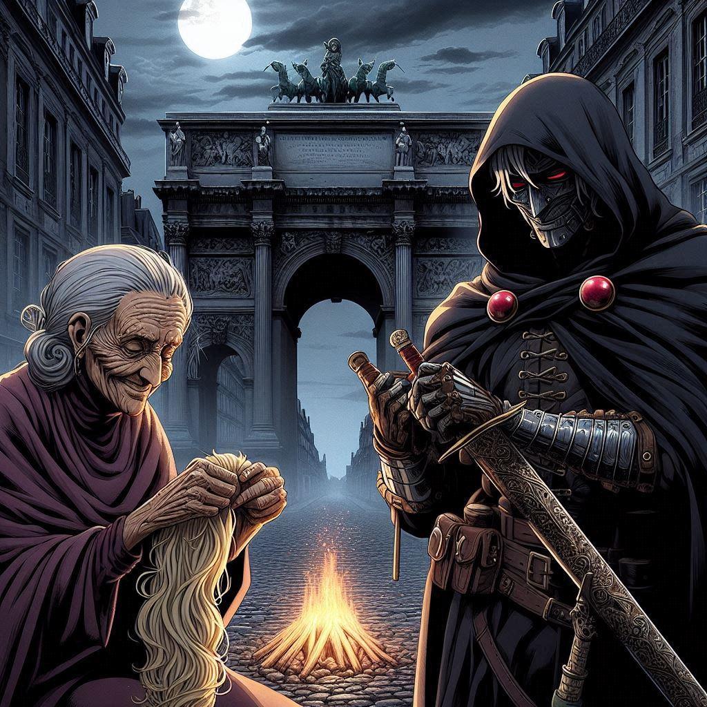 金髪のウィッグを手にした老婆と、筋骨逞しい覆面の男。