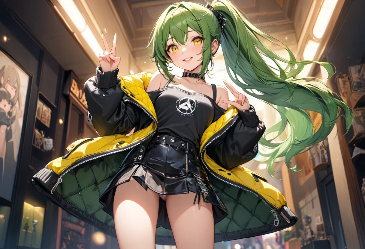 ④黒タンクトップ、ミニスカート、オフショイエローパーカー