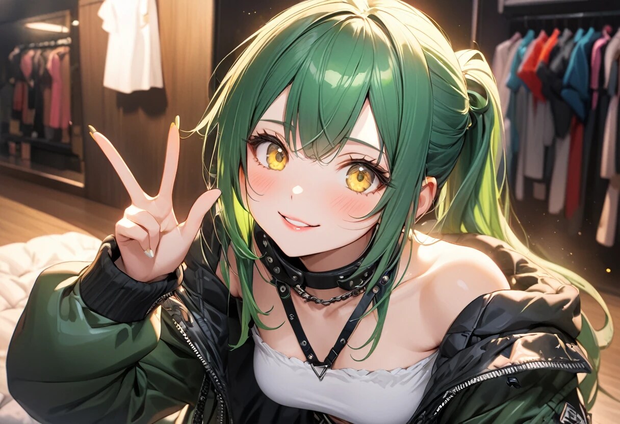 ⑤パンクガール風ネックチューブオフショルシャツ、首アクセ、ダークグリーンパーカージャケット