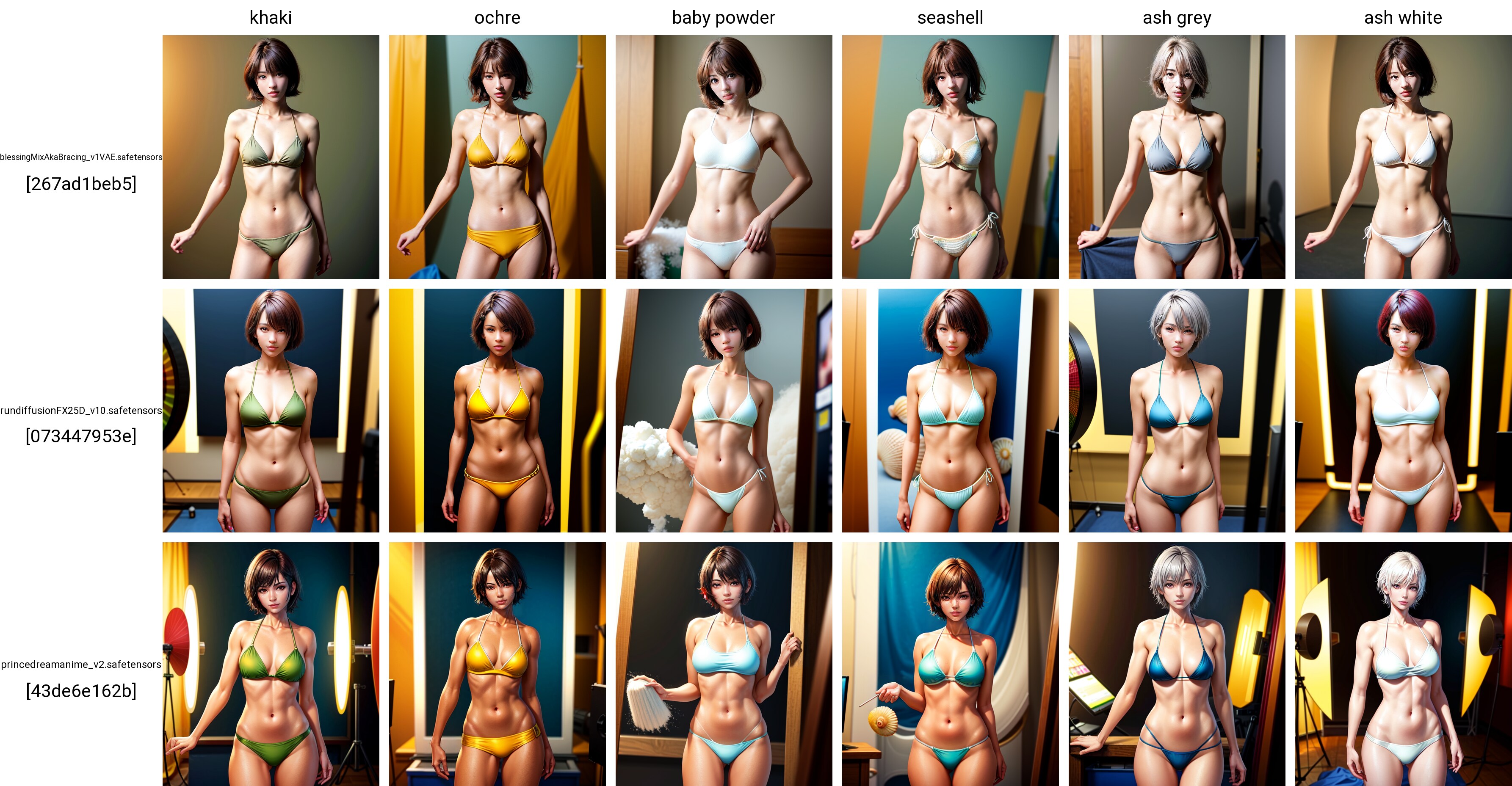 今回の色指定プロンプトは物体が多めだからか、背景、構図、水着、髪色に影響出まくりです。