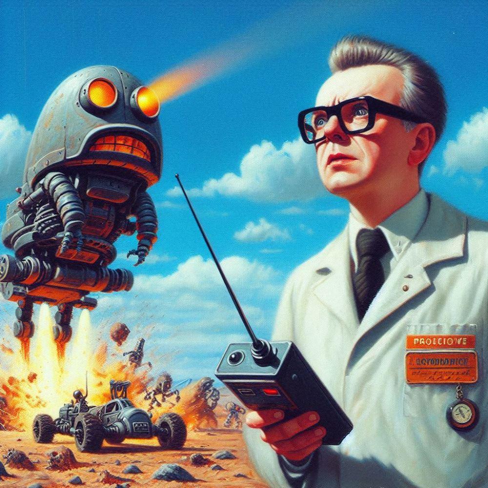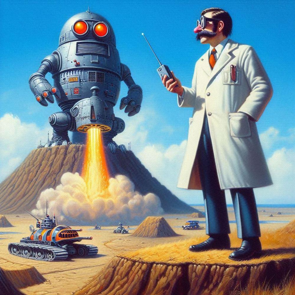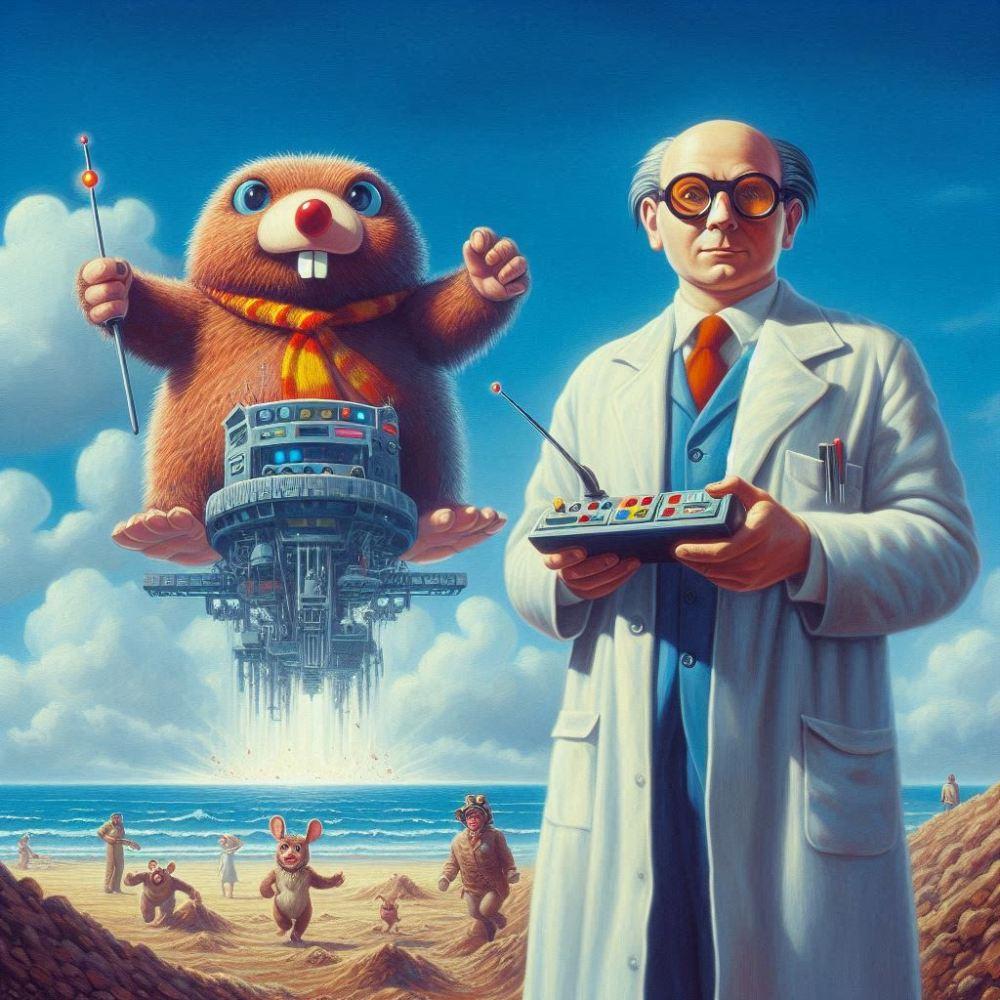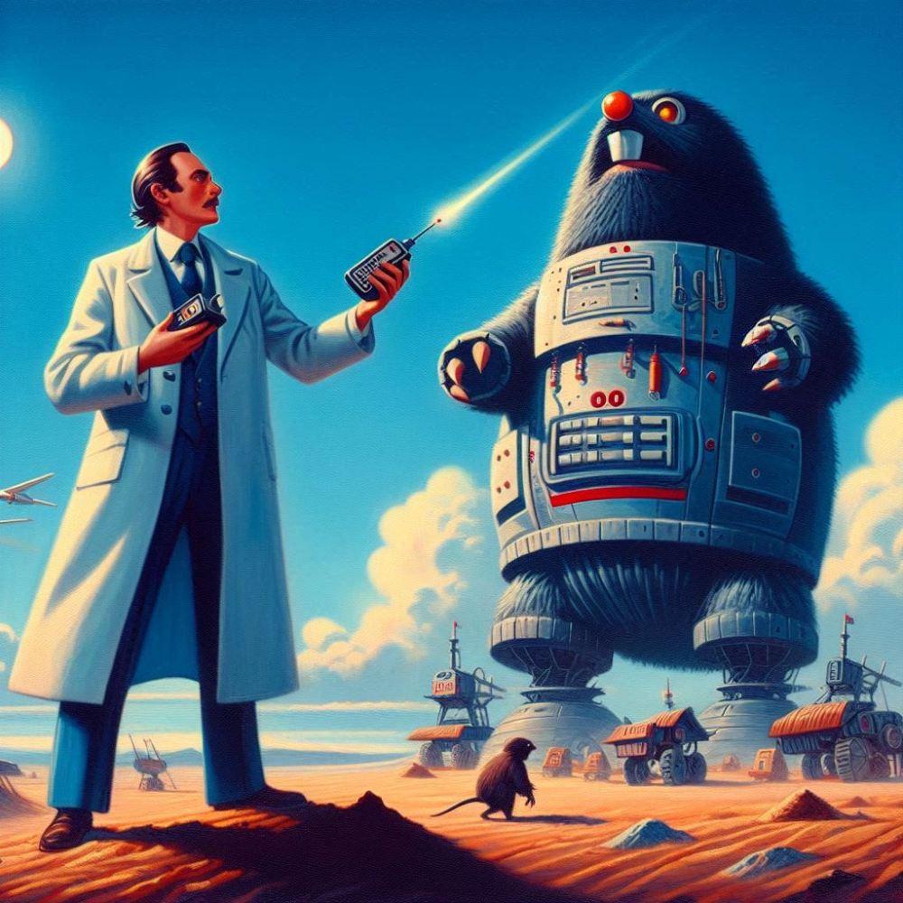 油絵SF、白衣のモグラ博士、巨大モグラロボ発進
