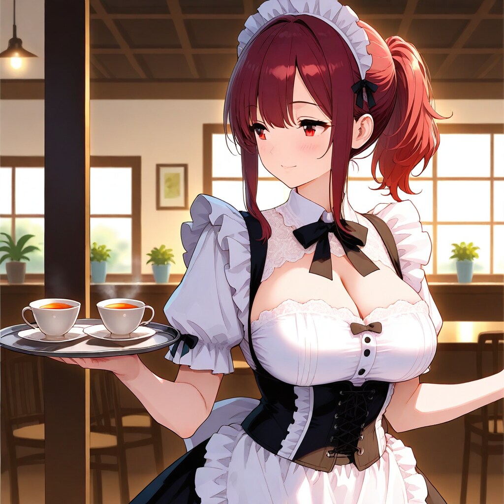 30歳のメイドカフェ店長は、赤いツインテールと赤い瞳が印象的な、ぽっちゃり体型でグラマラスな魅力を持つアニメ風キャラクター。広報ポスター用の「横顔」撮影では、クラシックで上品な赤と白を基調としたフリル付きメイド服に身を包み、柔らかく微笑むその表情が温かさと包容力を感じさせる一枚に仕上がった。彼女の丸みを帯びた頬と大きな胸元、エプロンのリボン、紅茶を運ぶ優雅な手元まで細部がこだわり抜かれたベストショット。