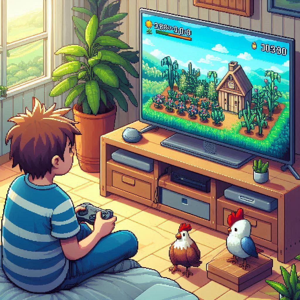 家庭用ゲーム機の箱庭ゲームを自分の部屋で遊ぶ少年