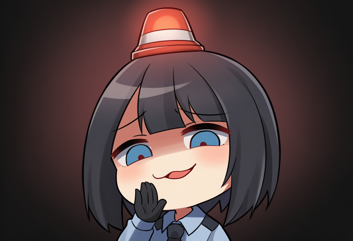 girl, blue eyes, black hair, shor hair, red police siren light on head, chibi, smug face, police, smirk,: 3, seductive_smile,giggle,upper_body,,whispering hand, face_focus,parted_lips