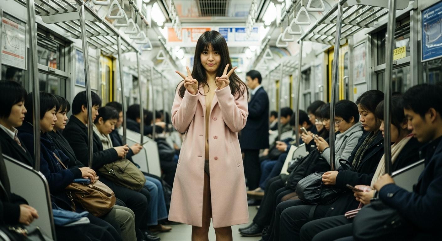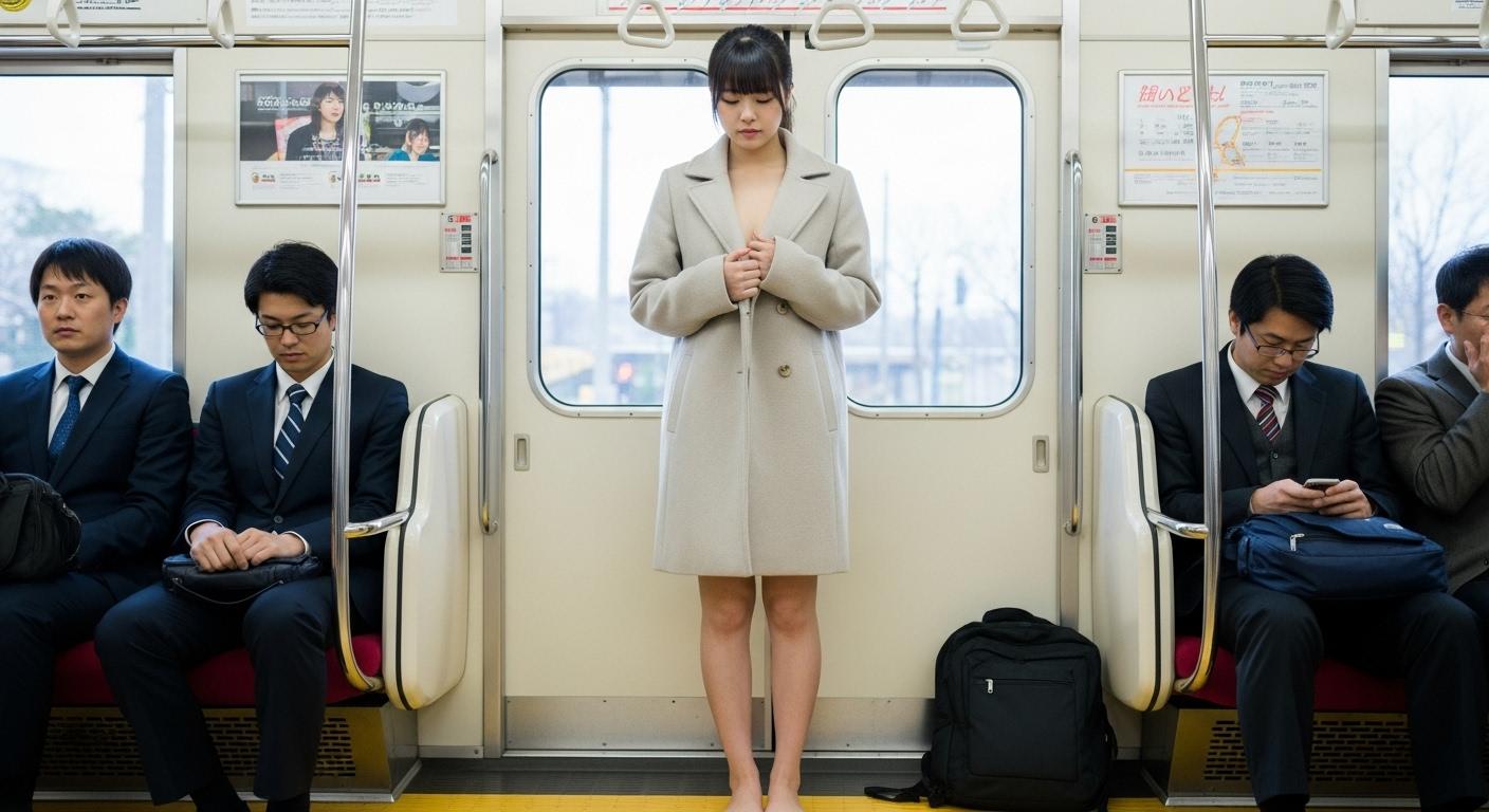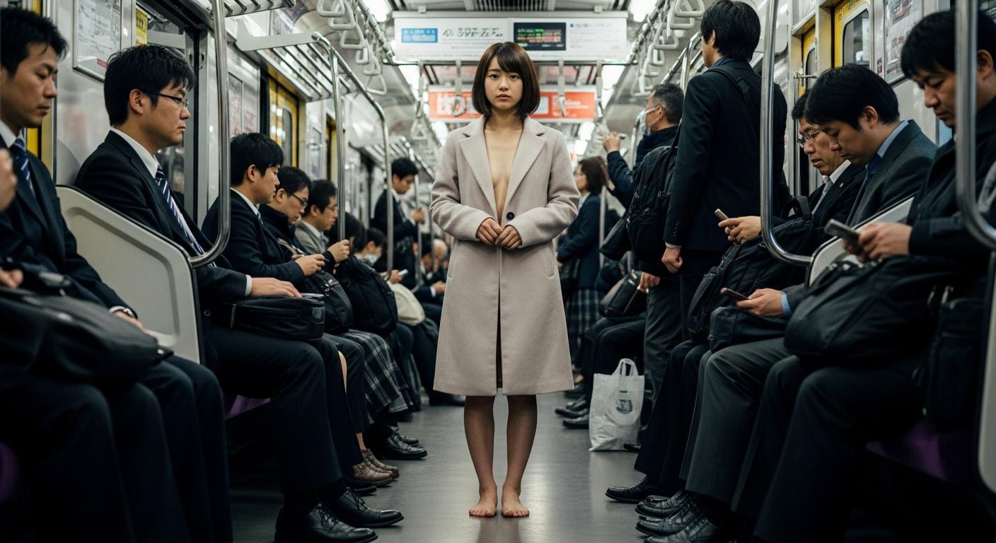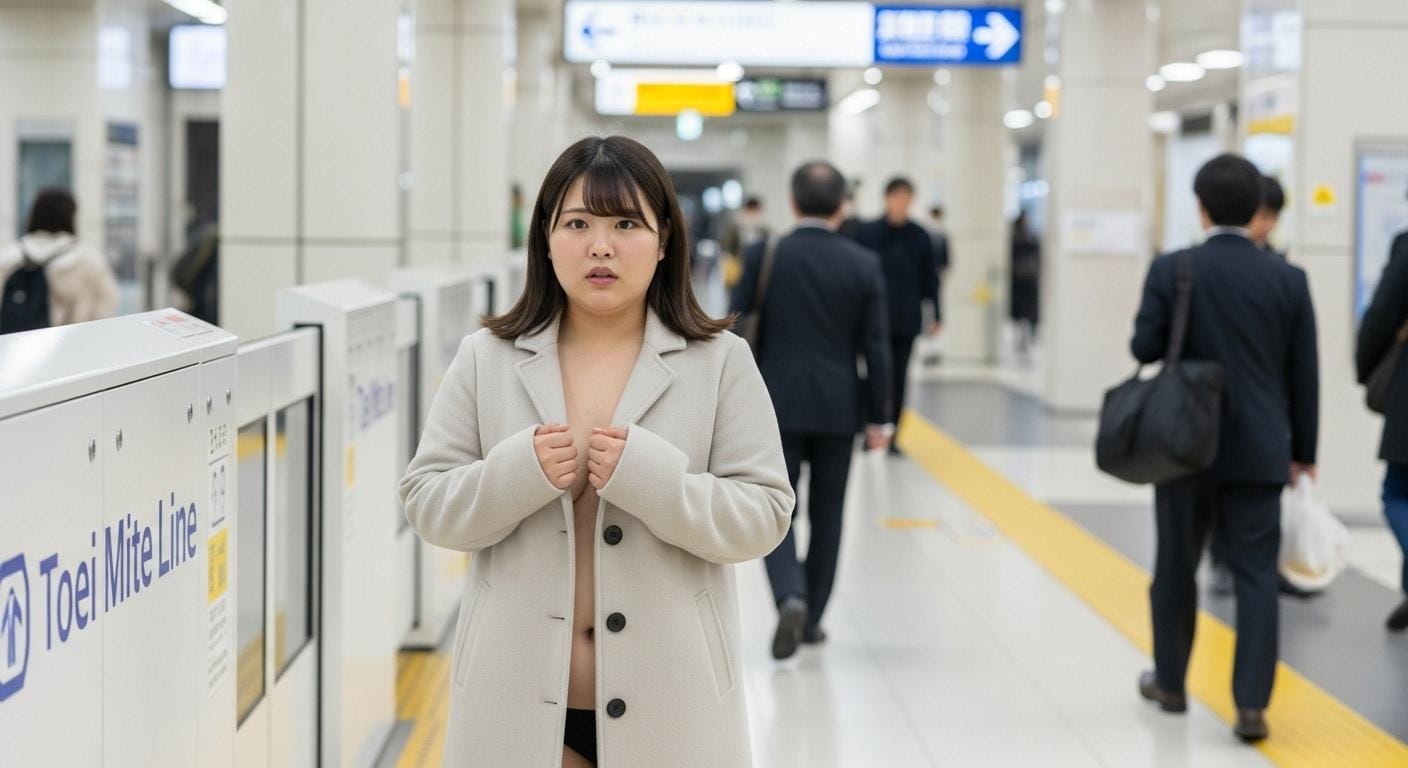 コートの中に秘密を抱えて地下鉄に乗り込む女性