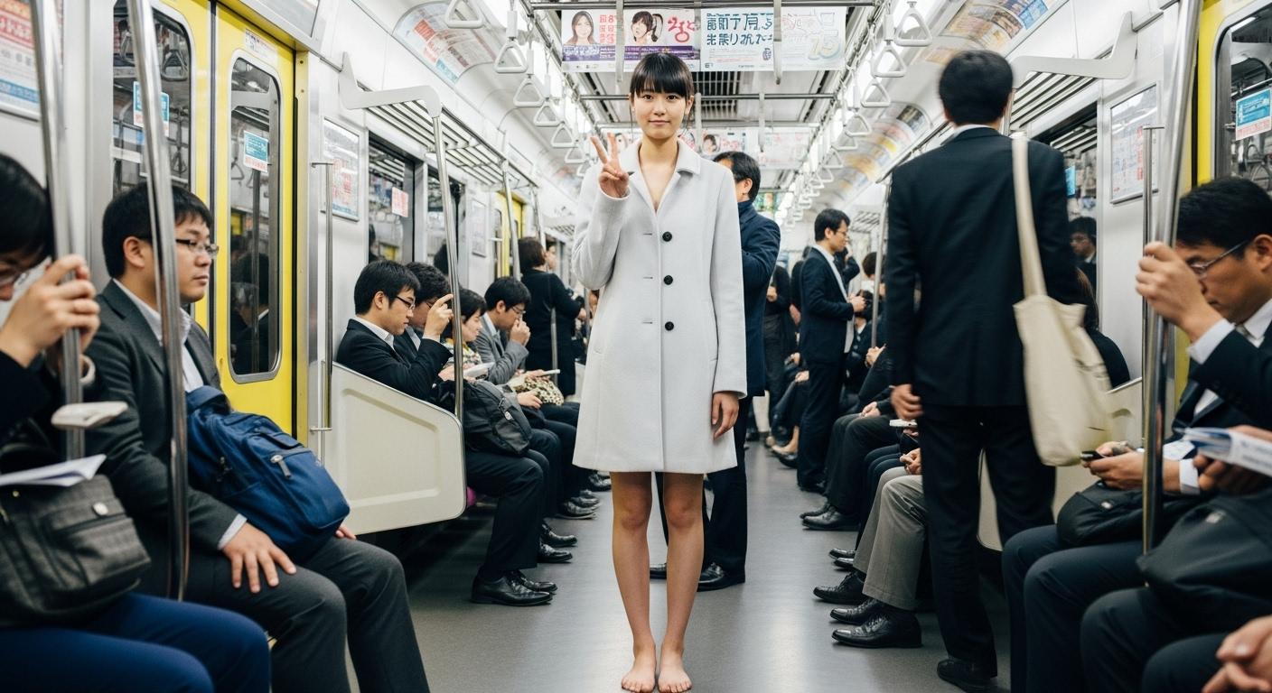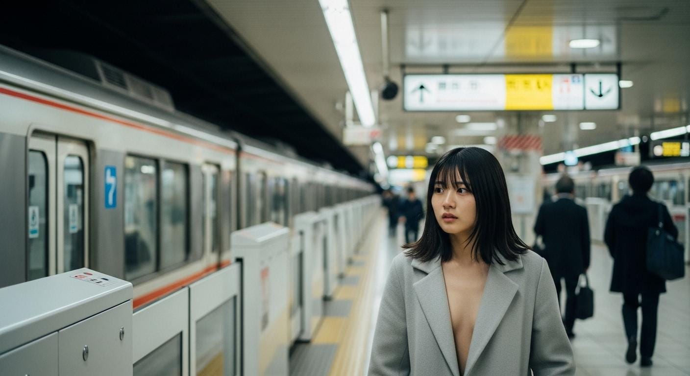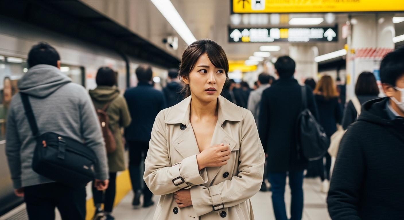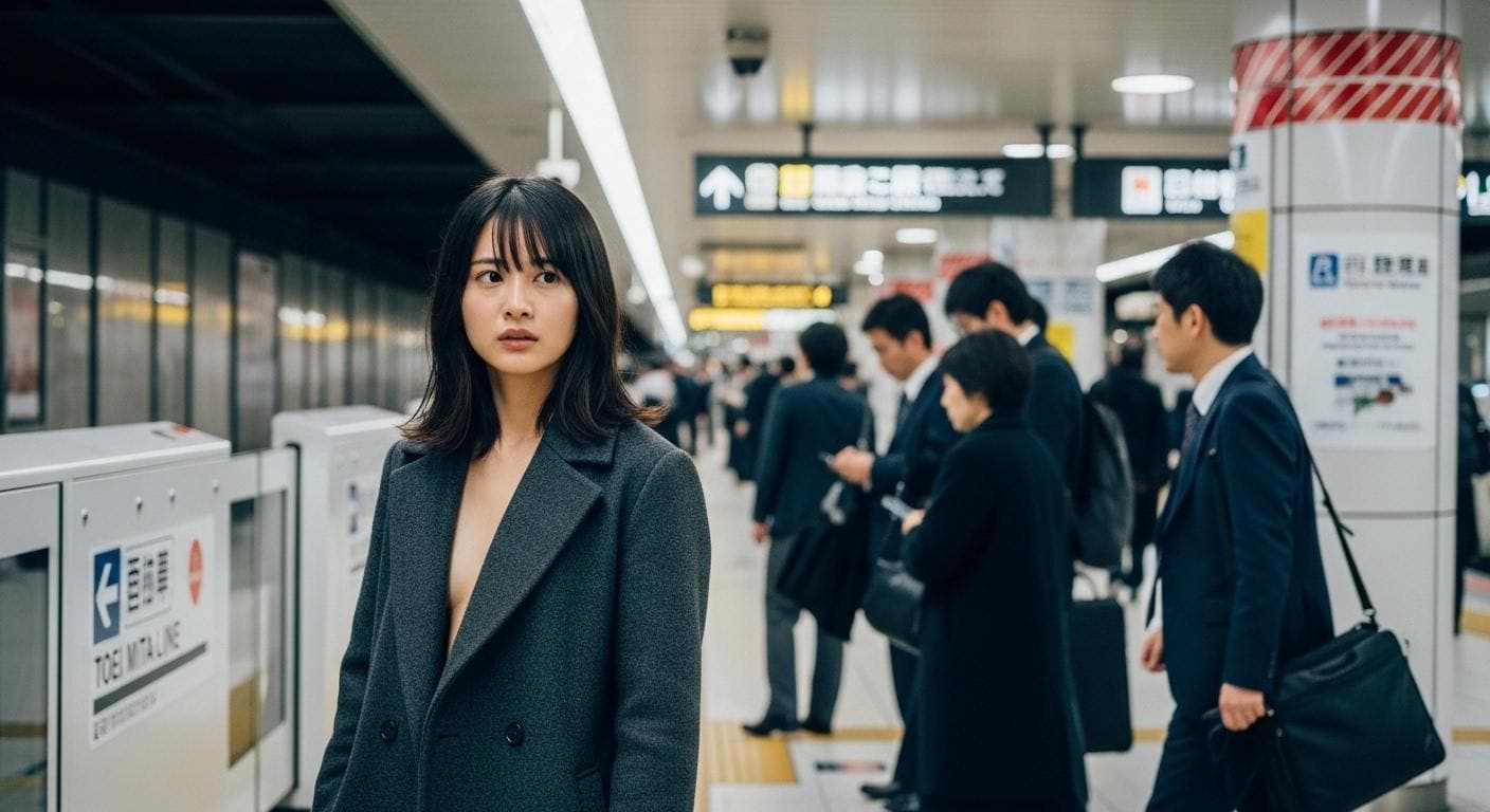 コートの中に秘密を抱えて地下鉄に乗り込む女性