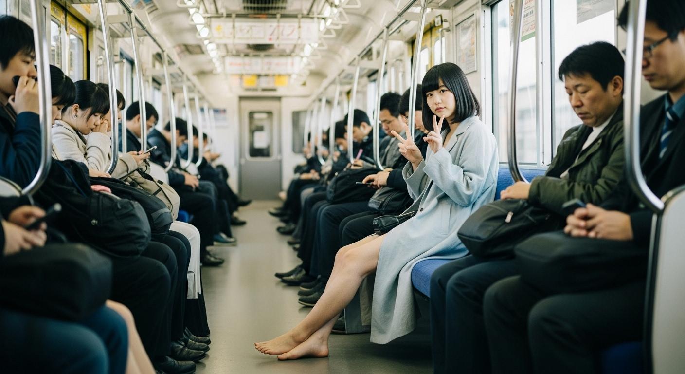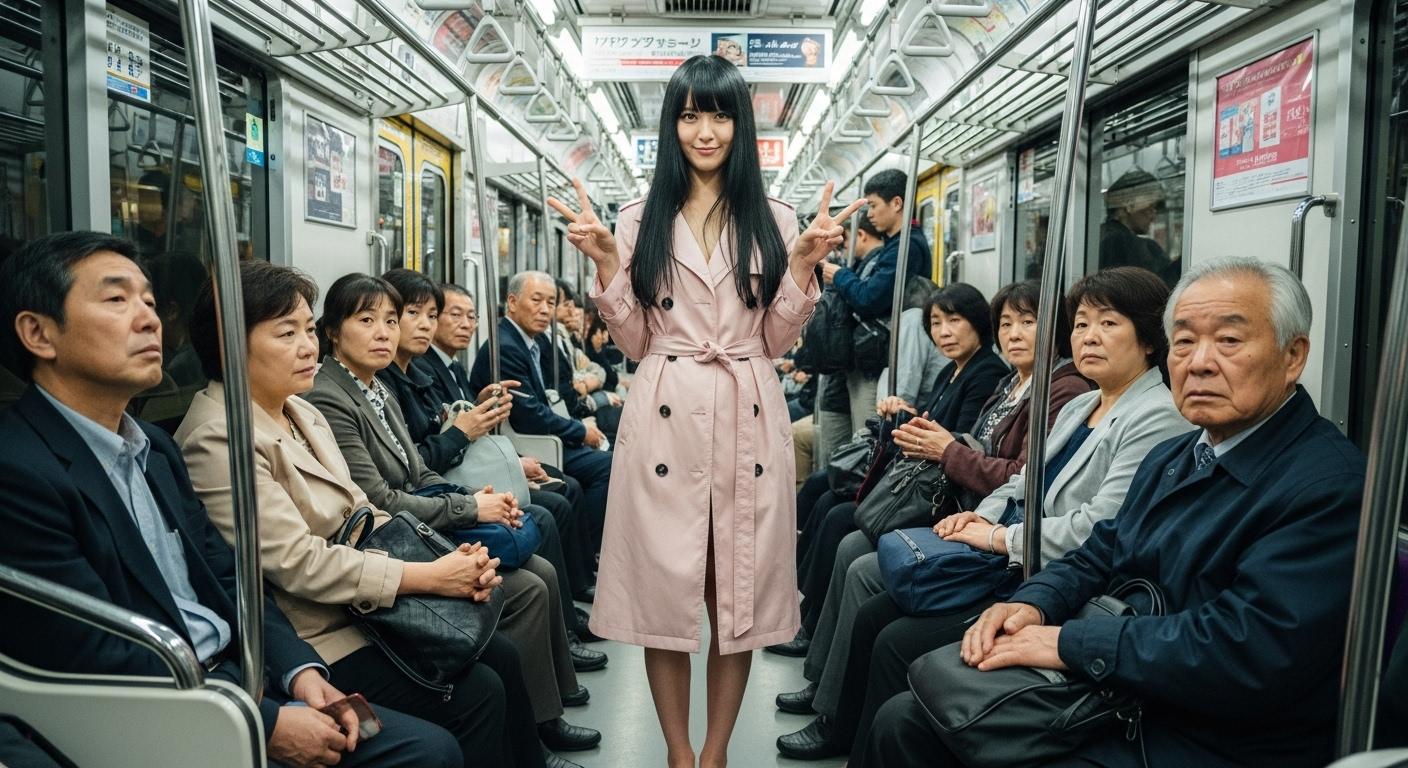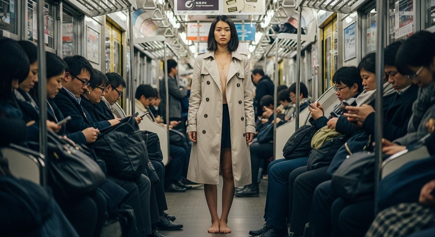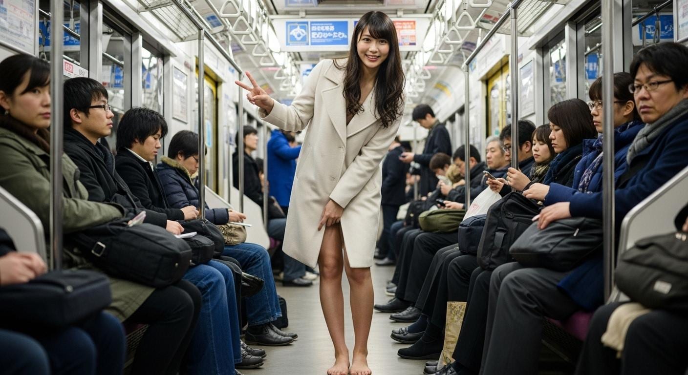 コートの中に秘密を抱えて地下鉄に乗り込む女性