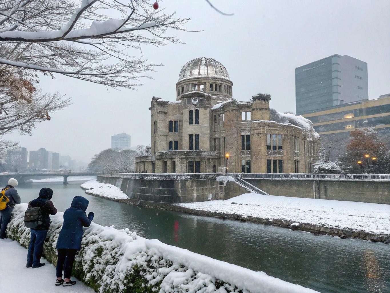 原爆ドーム周辺はめったに雪が降ることがないので、100年に1度程度の寒波が来ないとこんな雪景色にはなりません。
