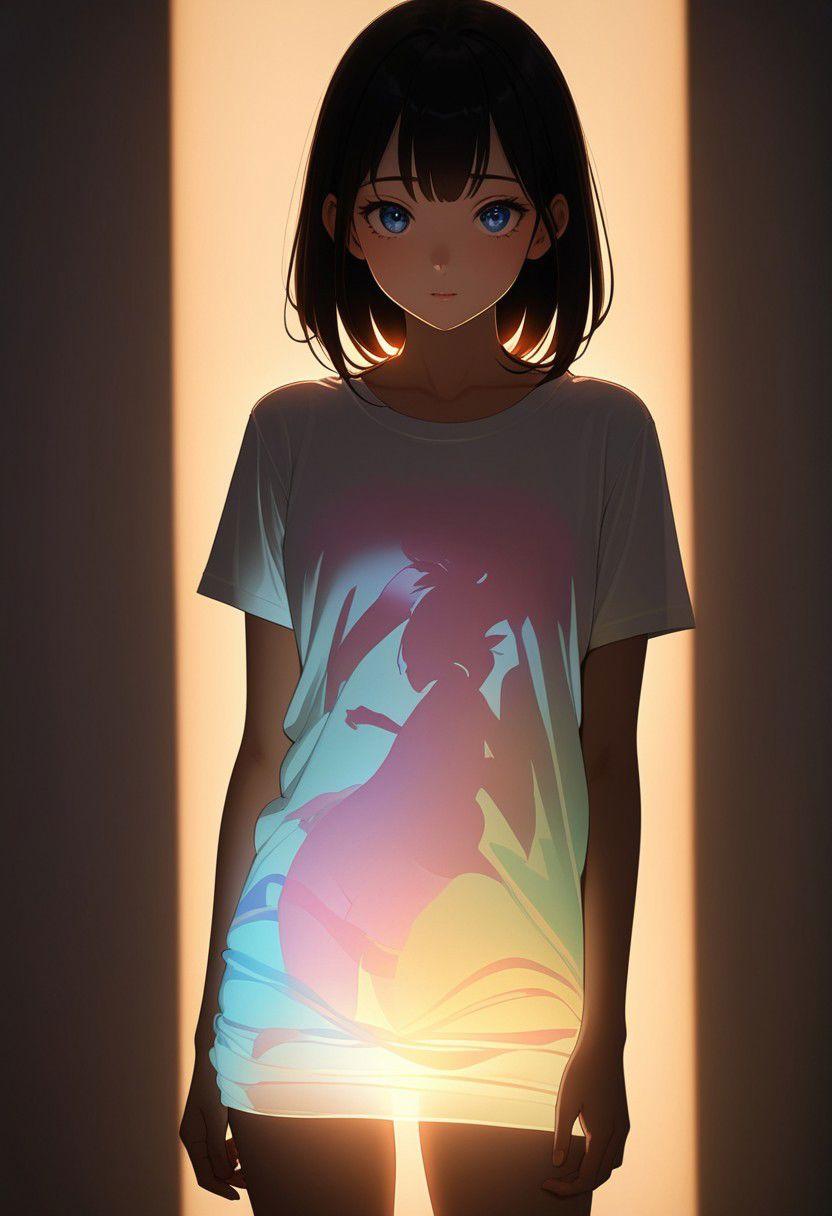 作品は「ポートレート(光と影)」シリーズ+Tシャツ上のプロジェクションマッピングライトのイメージ(逆光・影&コントラスト強め)で生成したものです。