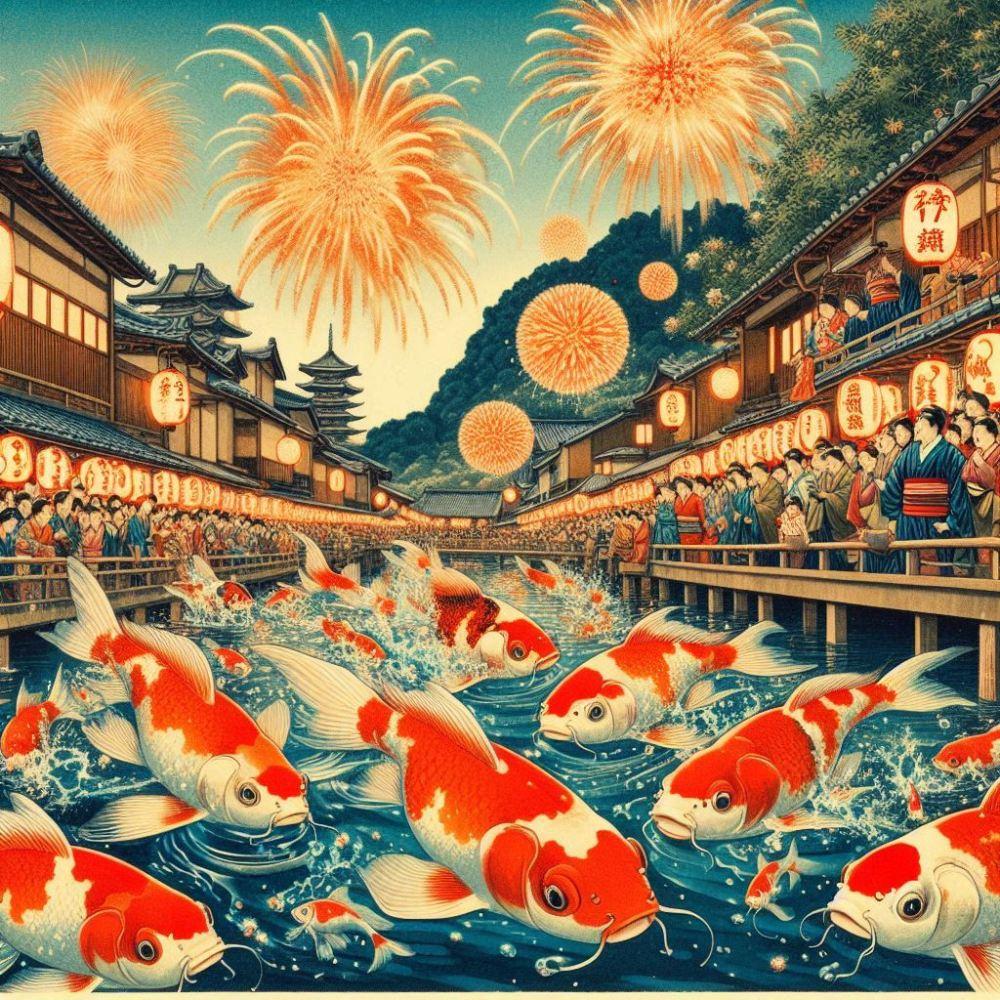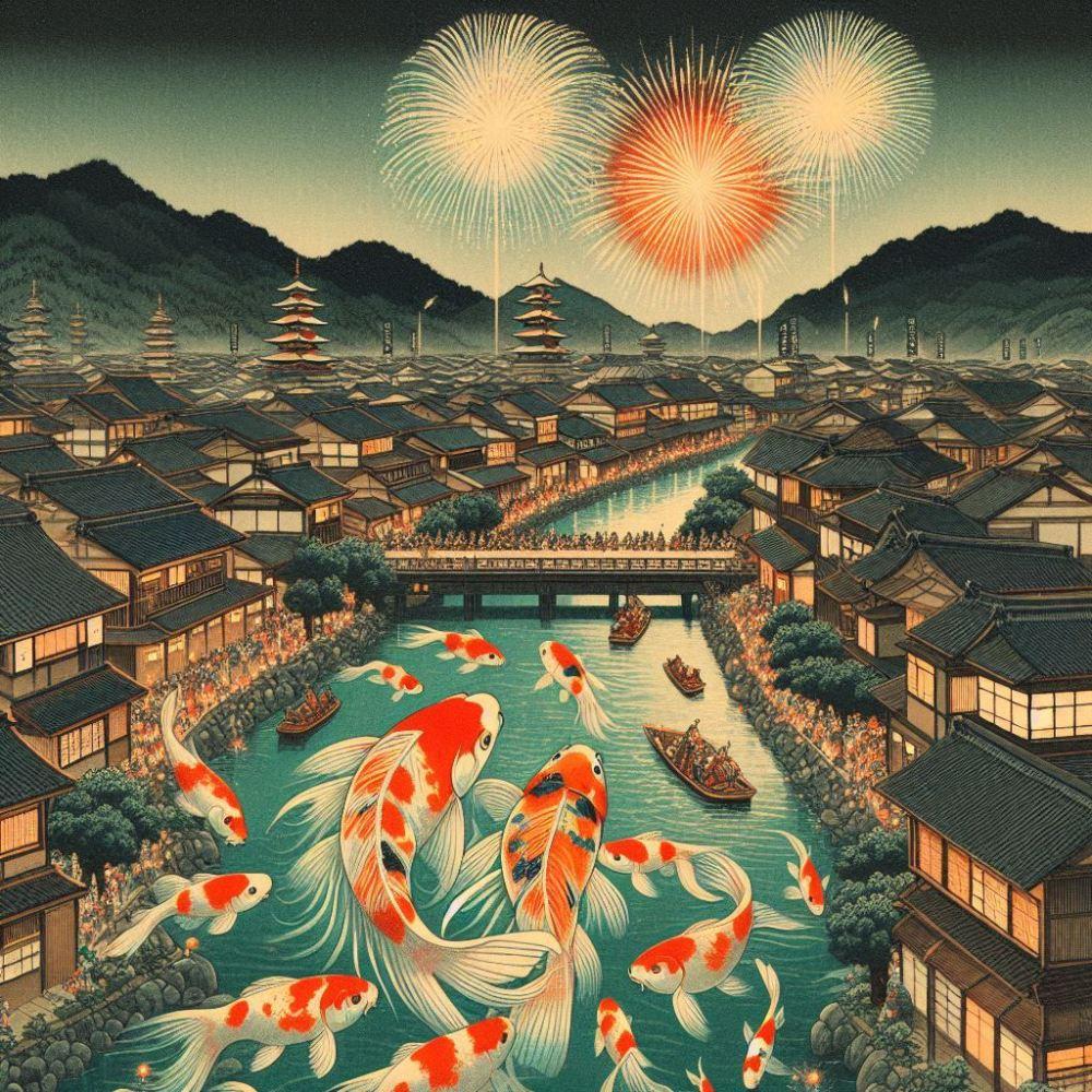 浮世絵 真夏の江戸の町を泳ぐ金魚達&金魚草&花火大会