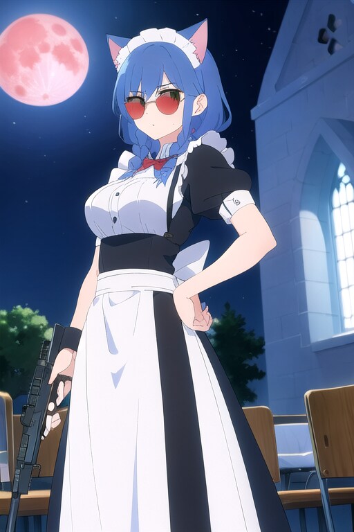 青い猫耳、白と黒を基調にしたロイヤルベースな服、サングラス、