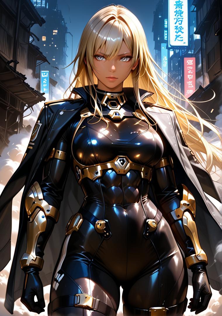black exo-combat suit with reactive plating that shifts tone under light # 光に反応して色調が変化する装甲を持つ黒いエクソコンバットスーツ