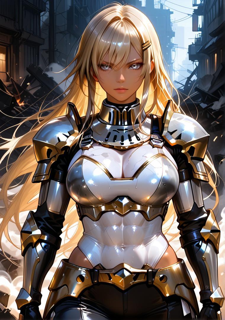 silver-white body armor with smooth curves and holographic sheen # 滑らかな曲線とホログラフィックな輝きを持つ銀白のボディアーマー
