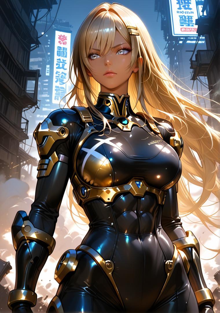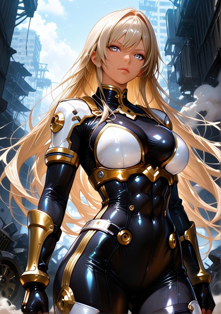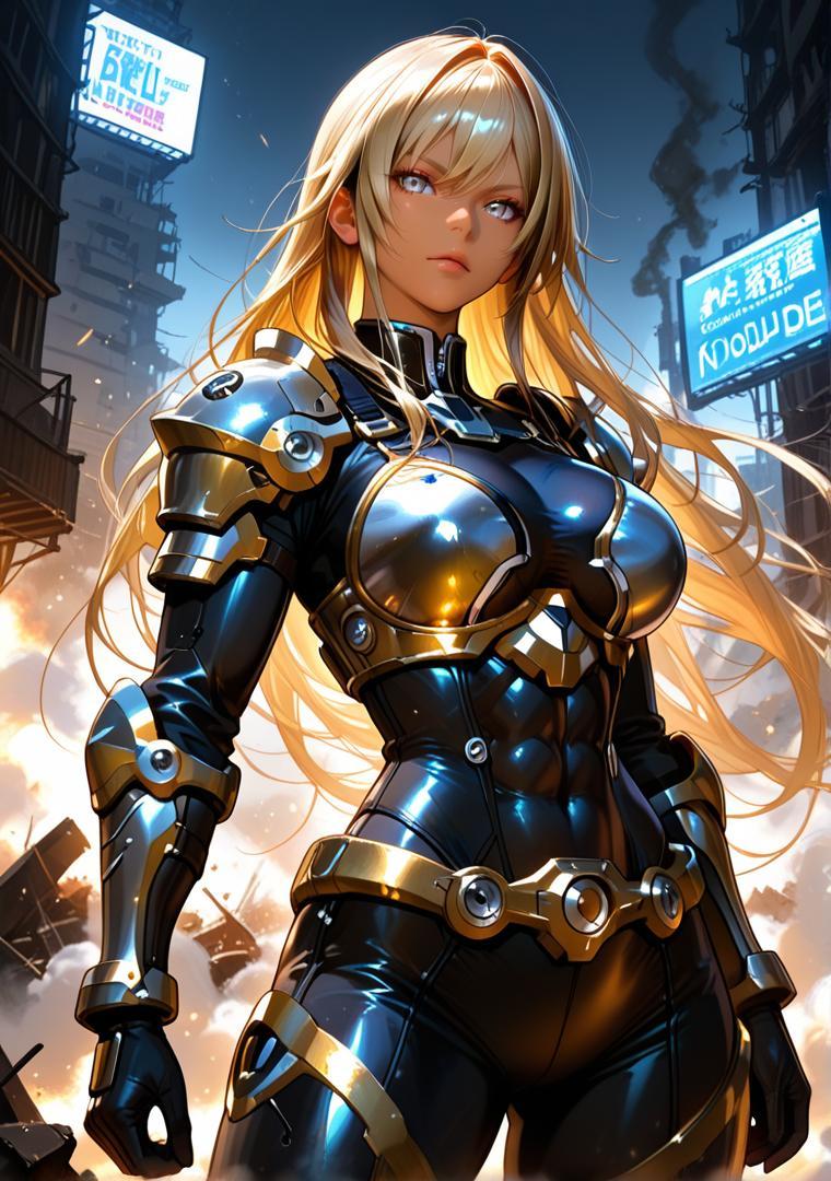 sapphire blue armored bodysuit with layered composite plating and soft glow seams # 複合層装甲と淡く光る縫い目を持つサファイアブルーの装甲ボディスーツ
