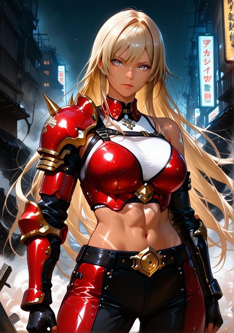 crimson red battle armor with layered plating, brushed metal finish # 層状装甲を持つ深紅のバトルアーマー、ブラッシュメタル仕上げ