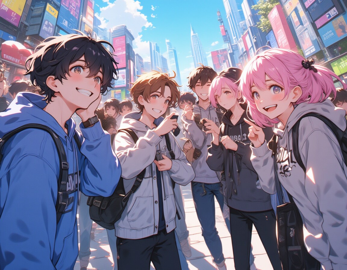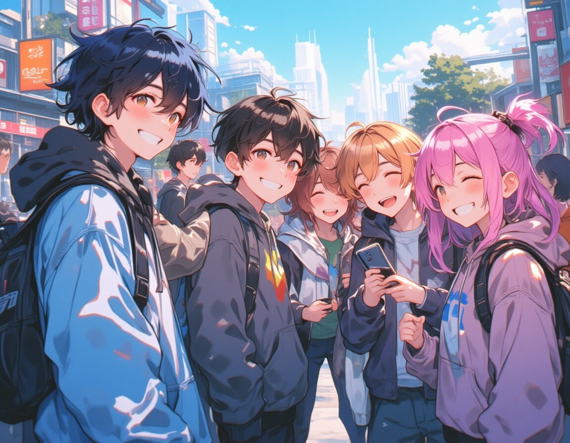 A group of Gen Z youths hanging out in a modern city environment,wearing trendy hooded sweaters and jackets in colors like blue,grey,and pink,with a mix of black,brown,and pink hair. Their expressions are cheerful,with open smiles and casual interactions. Some are taking photos or using their phones,others carrying backpacks,all exuding a relaxed,stylish vibe. The scene captures the spirit of today’s connected and fashion-forward generation,with skyscrapers and bustling streets in the background.,
