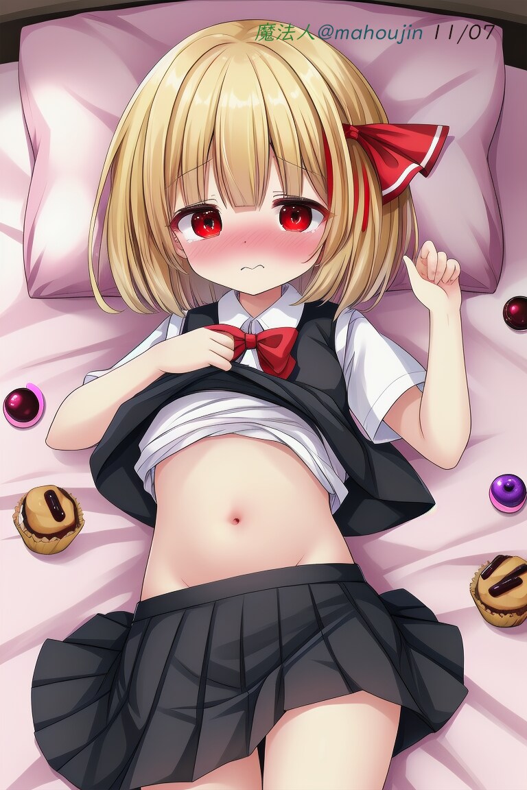 今月はお腹を見せたらお菓子をあげると言われて二つ返事で見せる事にしたけど、じっくりと見られて段々恥ずかしくなってきたルーミアです。