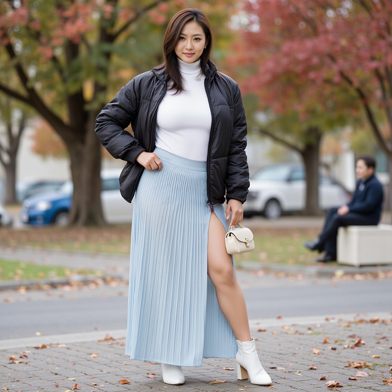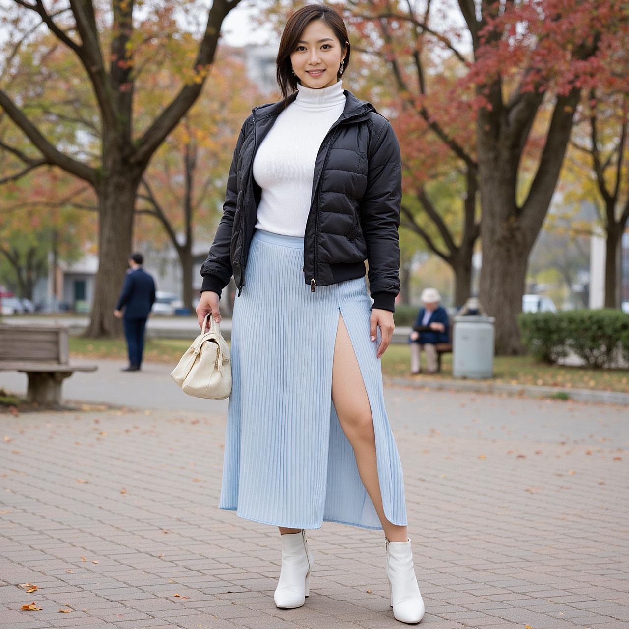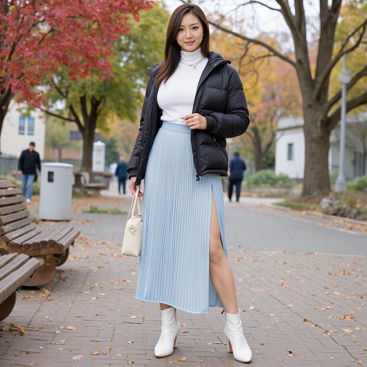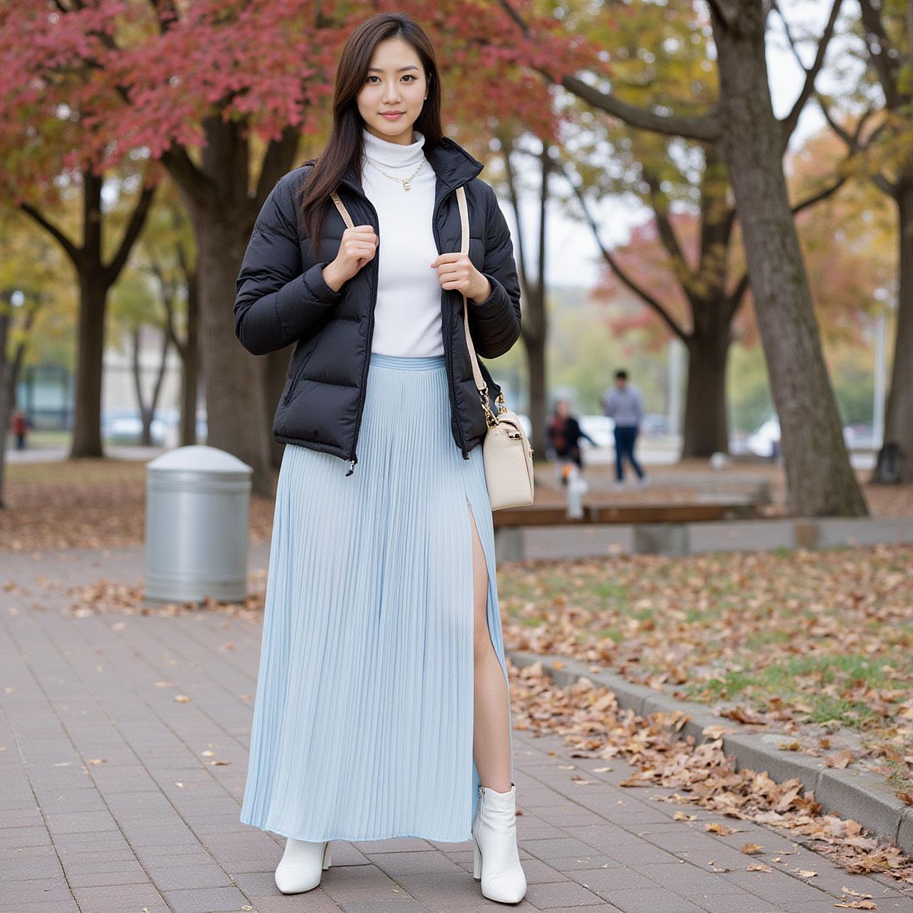 折り目の入ったスカートの上品な雰囲気と、ダウンのカジュアルさとのギャップが