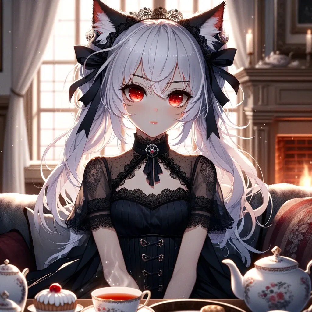黄昏の琥珀色の輝きの中で、猫の乙女が静寂の中でお茶を共有し、彼女の目は静けさの中で物語を語ります。