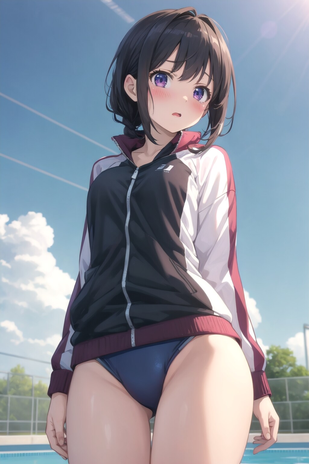 jacket partially removed, heart in eye, burnt clothes, holding fishing rod, kanji, doujin cover, pentagram, tape gag, adjusting headwear, red socks, friends, cloud print, coke-bottle glasses, oral invitation, competition school swimsuit, barbell piercing, gradient legwear, prisoner, blood on breasts, wind chime, carrying over shoulder, tape measure, flaming weapon