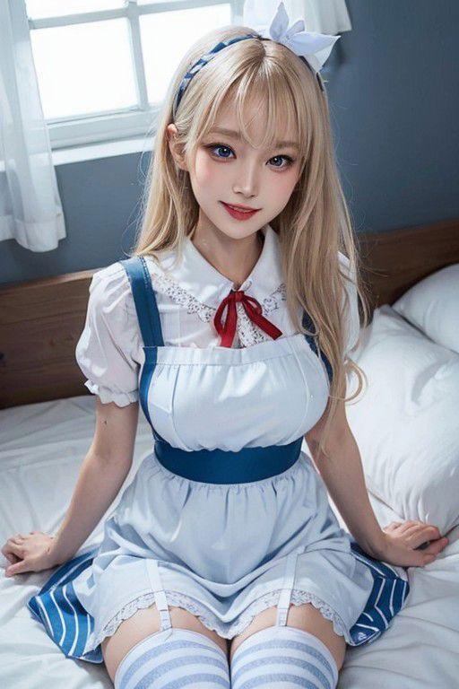 (透明肌:1.1)、(ボリューム照明:1.4)、ベッドに座る、開脚、寝室の背景、