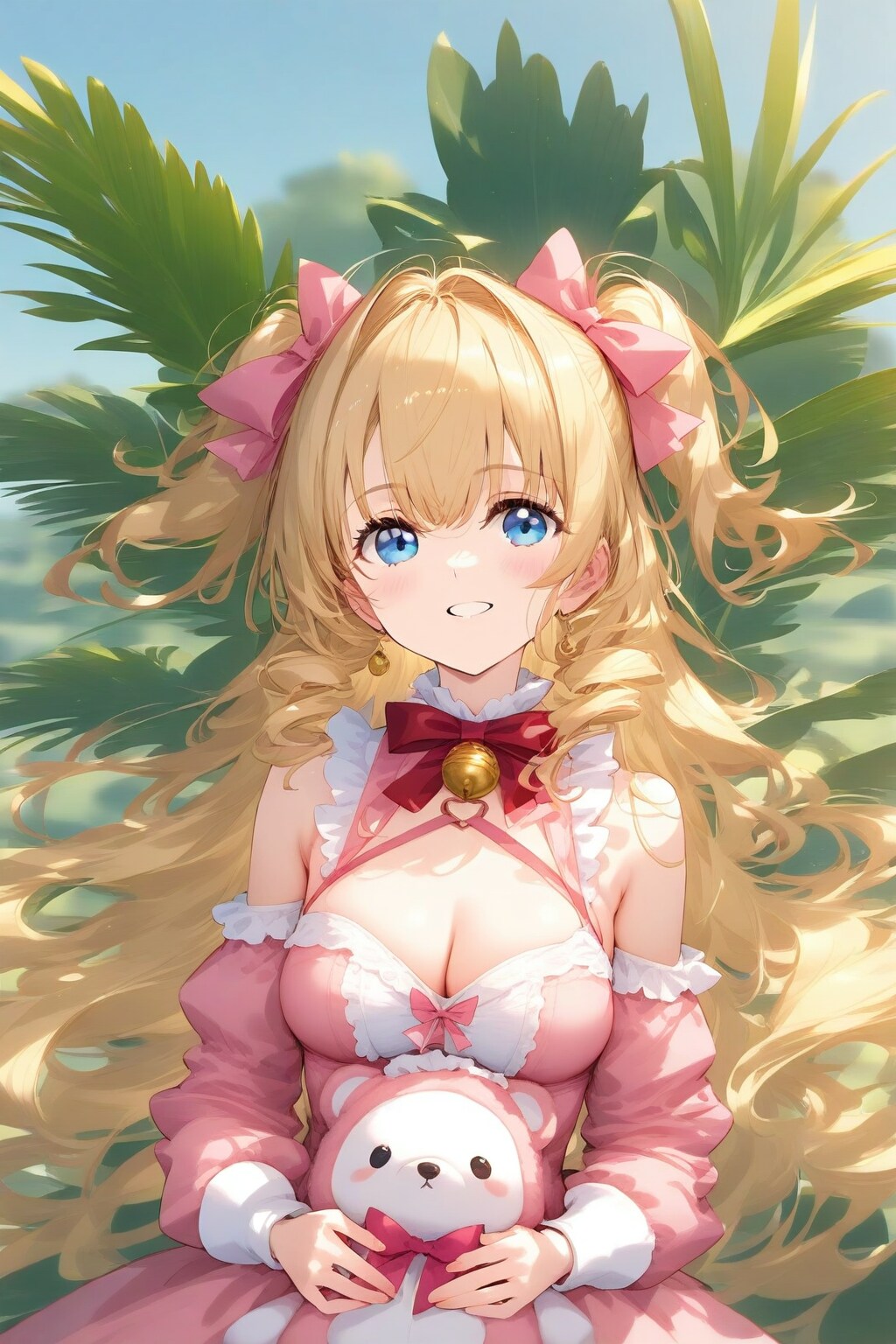 innocent twin tails girl, pretty ribbon edge outfit, holding animal toy, iron object tie,