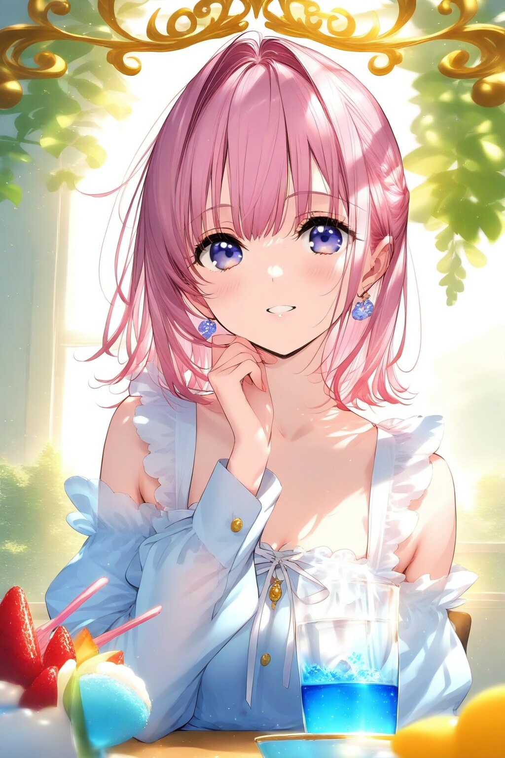 pink hair sister smiling, temptation pose, armpit, earring, strawberry ice parfait, alcohol on table , tank top sundress, iron art edge,