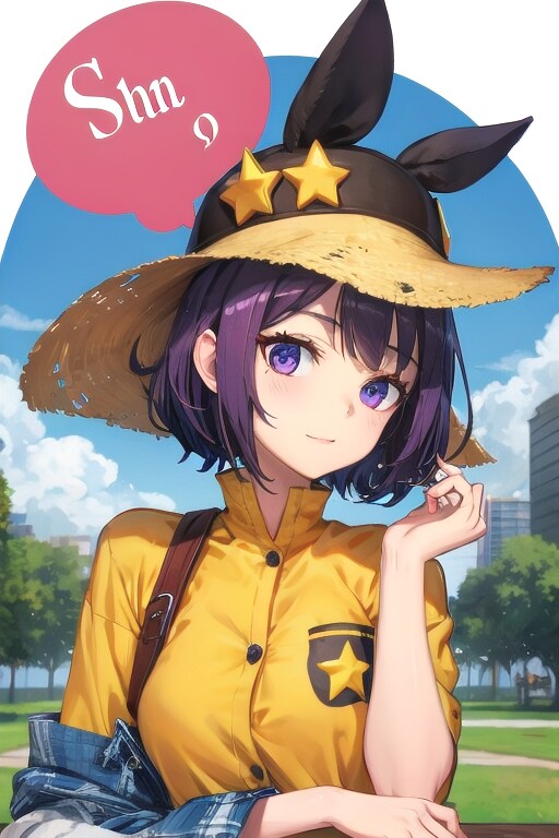 purple haired girl, smiling, summer, text photo art, clothes on arm, animal star hat, star on pocket, adjusting hair, tree, tower, park,