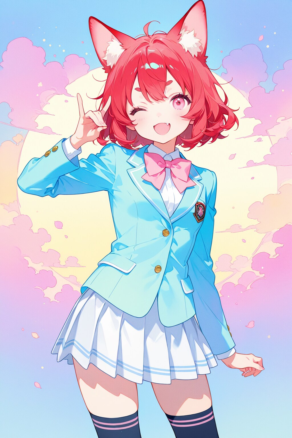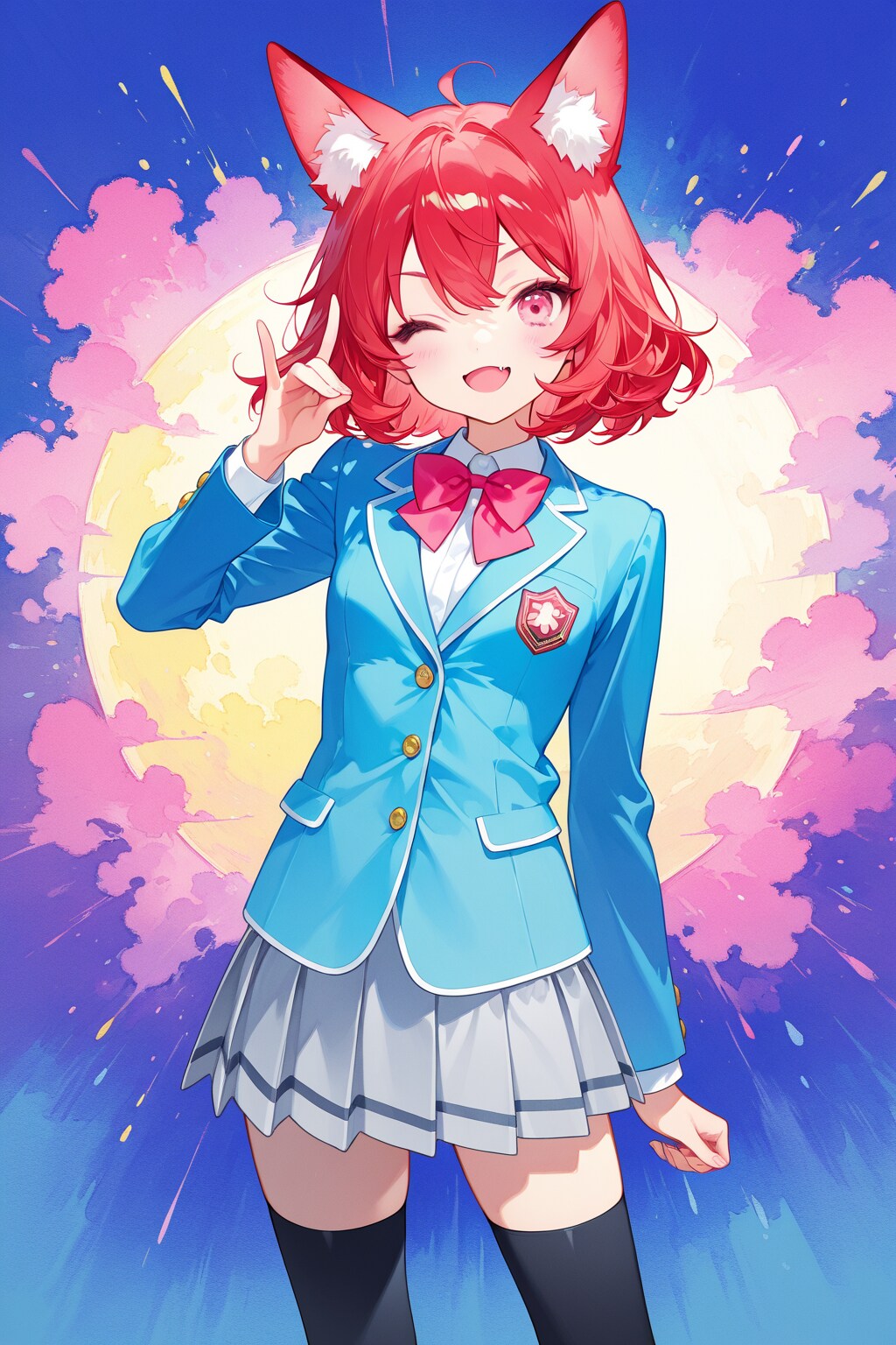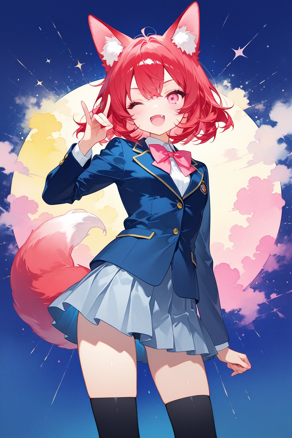学生が主体のキャラクターではないので学校の絵はあまり創らないのですが、一応ちちぷいフレンズ学園に通っているという設定の、うちの子代表の狐娘カエデで制服ニーハイをしつつ狐の影絵ポーズをしてみました。(^ω^)