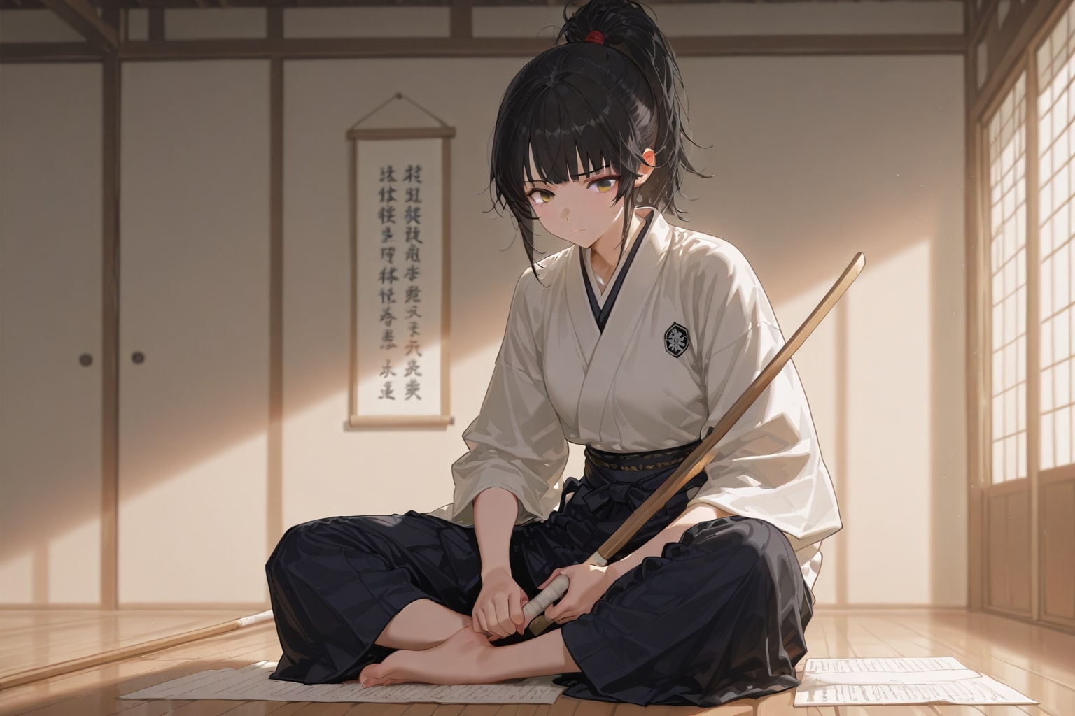 汗で濡れた前髪、震える指先、袴の裾から覗く素足。