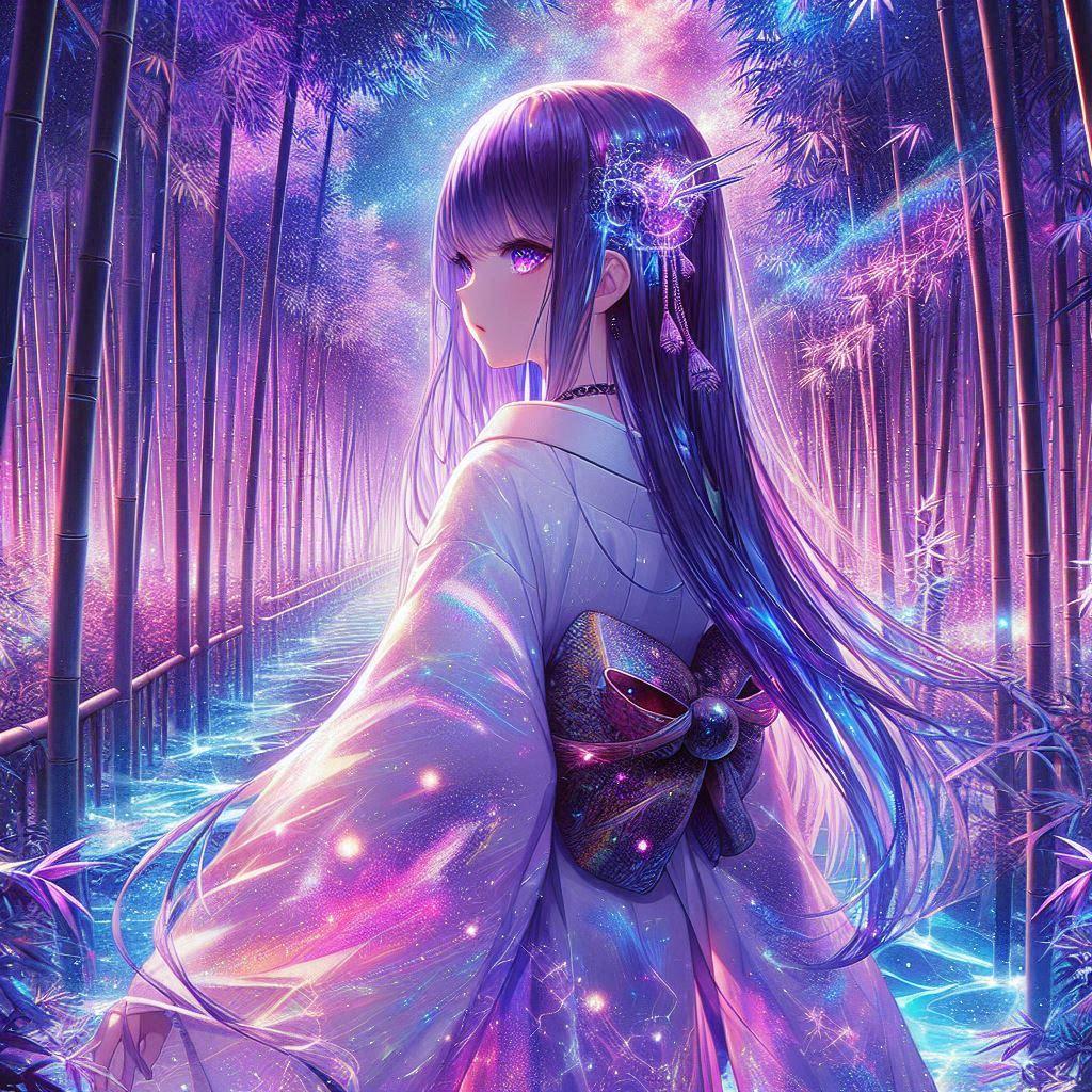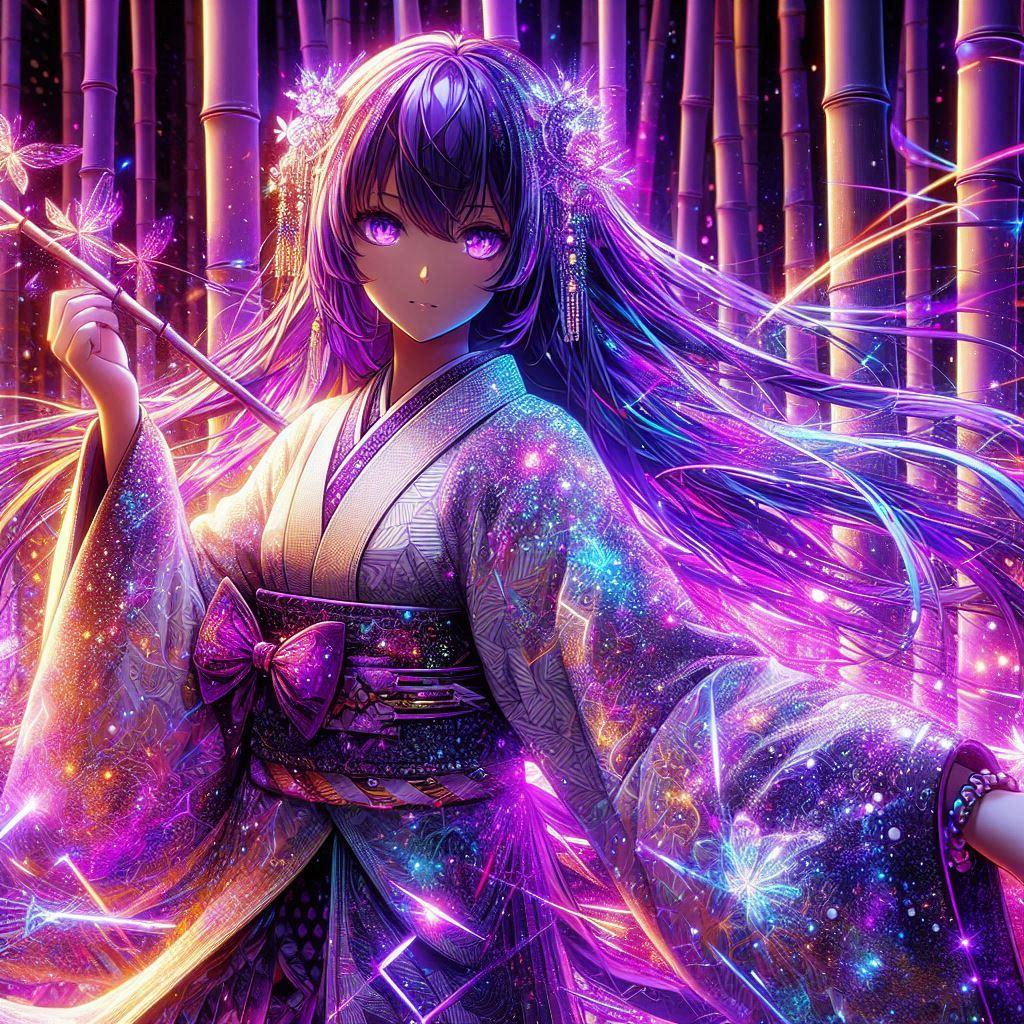 背景: キャラクターは、空間と時間の裂け目に立ち、複数の次元が重なり合う場所に存在します。背景は、現実世界の京都の竹林をベースに、そこに異なる次元の風景が浮かび上がります。たとえば、一部の竹はエネルギー体となり、別の部分では空間がねじれ、もう一つの宇宙が垣間見えるような表現。背景全体は、どの角度から見ても異なる次元が視界に入るようなデザインとなっています。