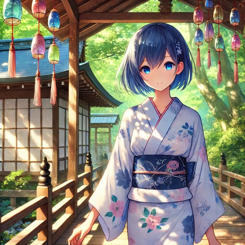 夏の午後、寺社の参道を歩くボブ子ちゃん。軒下に吊るされた風鈴が、木漏れ日とともに涼しげな音を響かせる。蝉の声と重なり合い、時間がゆっくりと流れていく。