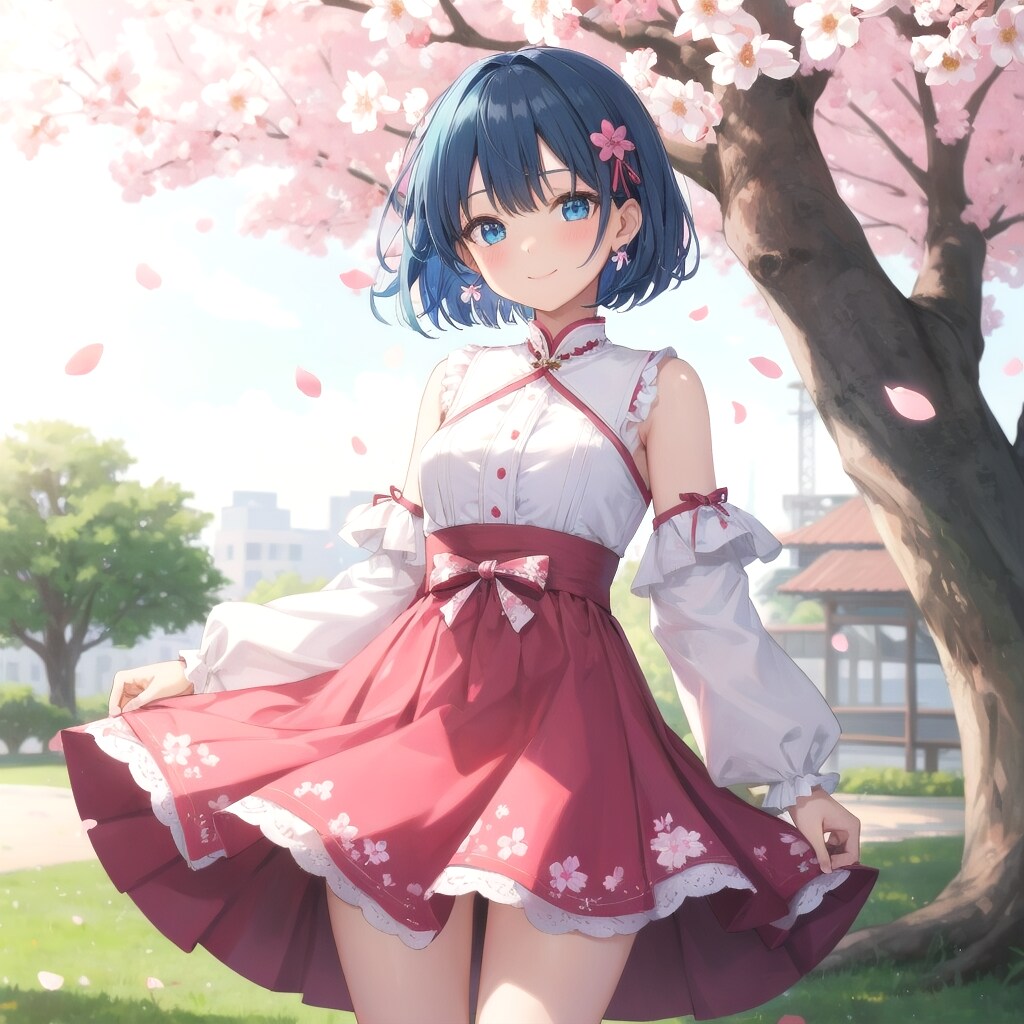 青髪ボブ子ちゃんが、桜をイメージした淡いピンクのワンピースを着て撮影。軽やかな生地にレースの装飾が施され、春風にスカートが揺れる。背景は公園で、暖かな日差しが差し込み、桜の花びらが舞っている。