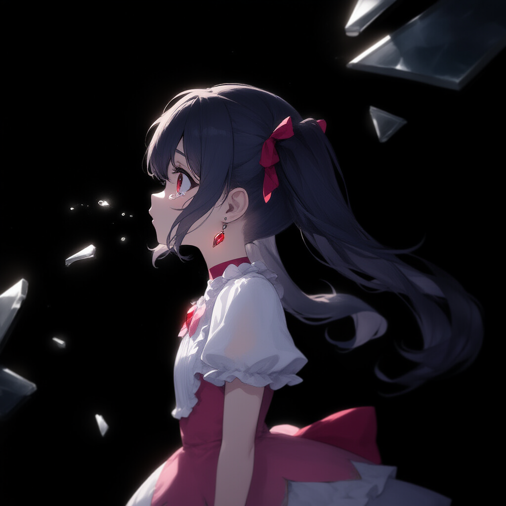 girl, little child body, magical girl, frilly magical girl clothes, skirt, head down,long hair, twintail,Tears flowing in the wind,face in profile,red eyes,earrings, upper body, blowing through wind