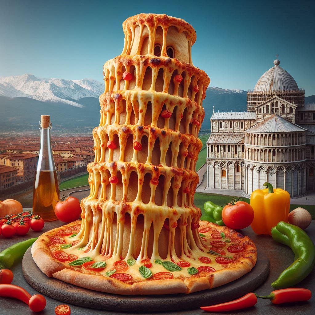 ピサの斜塔の絵と、ピッツァの絵が流れてきたので、ピザの斜塔…とか思ってDalle犬先生に出してもらいました